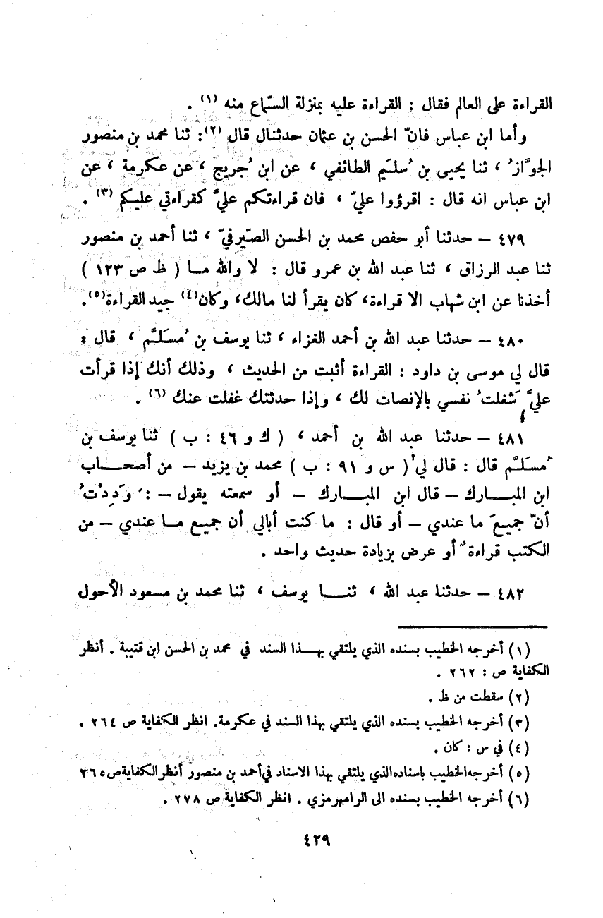 حَدَّثَنَا عَبْدُ اللَّهِ بْنُ أَحْمَدَ الْغَزَّاءُ، ثَنَا يُوسُفُ بْنُ مُسْلِمٍ قَالَ: قَالَ لِي مُوسَى بْنُ دَاوُدَ: «§الْقِرَاءَةُ أَثْبَتُ مِنَ الْحَدِيثِ، وَذَلِكَ أَنَّكَ إِذَا قَرَأْتَ عَلَيَّ شَغَلْتُ نَفْسِي بِالْإِنْصَاتِ لَكَ، وَإِذَا حَدَّثْتُكَ غَفَلْتُ عَنْكَ»