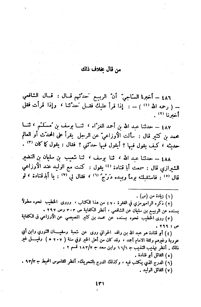 أَخْبَرَنَا السَّاجِيُّ، أَنَّ الرَّبِيعَ، حَدَّثَهُمْ قَالَ: قَالَ الشَّافِعِيُّ رَحِمَهُ اللَّهُ: «§إِذَا قَرَأَ عَلَيْكَ فَقُلْ حَدَّثَنَا، وَإِذَا قَرَأْتَ فَقُلْ أَخْبَرَنَا»