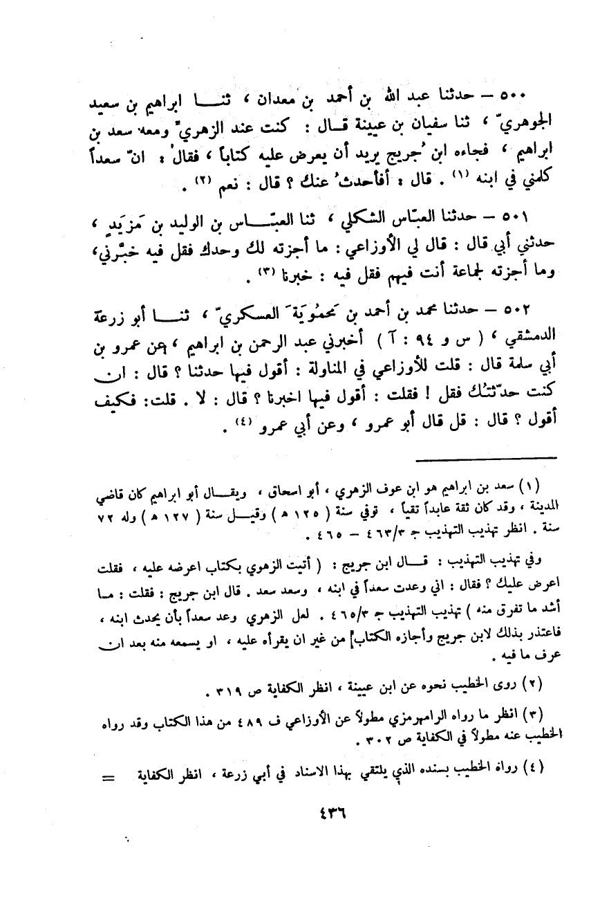حَدَّثَنَا عَبْدُ اللَّهِ بْنُ أَحْمَدَ بْنِ مَعْدَانَ، ثَنَا إِبْرَاهِيمُ بْنُ سَعِيدٍ الْجَوْهَرِيُّ، ثَنَا سُفْيَانُ بْنُ عُيَيْنَةَ قَالَ: " كُنْتُ عِنْدَ الزُّهْرِيِّ وَمَعَهُ سَعْدُ بْنُ إِبْرَاهِيمَ فَجَاءَهُ ابْنُ جُرَيْجٍ يُرِيدُ أَنْ يَعْرِضَ عَلَيْهِ كِتَابًا، فَقَالَ: إِنَّ سَعْدًا كَلَّمَنِي فِي ابْنِهِ قَالَ: §أَفَأُحَدِّثُ عَنْكَ؟ قَالَ: نَعَمْ "