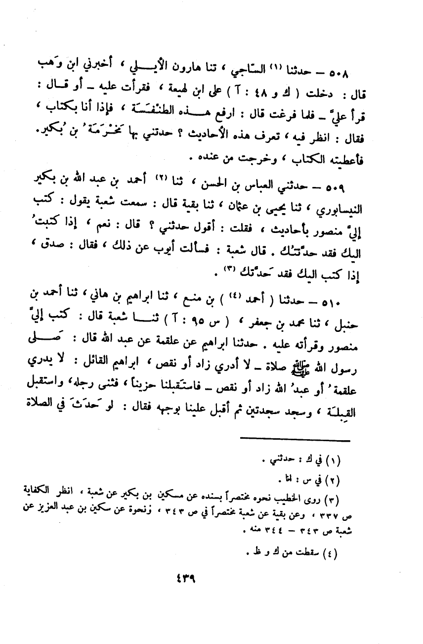 حَدَّثَنَا أَحْمَدُ بْنُ مَنِيعٍ، ثَنَا إِبْرَاهِيمُ بْنُ هَانِي، ثَنَا أَحْمَدُ بْنُ حَنْبَلٍ، ثَنَا مُحَمَّدُ بْنُ جَعْفَرٍ، ثَنَا شُعْبَةُ، قَالَ: كَتَبَ إِلَيَّ مَنْصُورٌ وَقَرَأْتُهُ عَلَيْهِ، حَدَّثَنَا إِبْرَاهِيمُ، عَنْ عَلْقَمَةَ، عَنْ عَبْدِ اللَّهِ قَالَ: صَلَّى رَسُولُ اللَّهِ صَلَّى اللهُ عَلَيْهِ وَسَلَّمَ صَلَاةً لَا أَدْرِي زَادَ أَوْ نَقَصَ - إِبْرَاهِيمُ الْقَائِلُ، لَا يَدْرِي عَلْقَمَةُ أَوْ عَبْدُ اللَّهِ زَادَ أَوْ نَقَصَ - فَاسْتَقْبَلَنَا حَزِينًا، فَثَنَى رِجْلَهُ، وَاسْتَقْبَلَ الْقِبْلَةَ، وَسَجَدَ سَجْدَتَيْنِ، ثُمَّ أَقْبَلَ عَلَيْنَا بِوَجْهِهِ، فَقَالَ: «لَوْ حَدَثَ فِي الصَّلَاةِ -[440]- شَيْءٌ لَأَنْبَأْتُكُمُوهُ، وَلَكِنْ §أَنَا بَشَرٌ أَنْسَى كَمَا تَنْسُونَ، فَإِذَا نَسِيتُ فَذَكِّرُونِي، وَأَيُّكُمْ مَا شَكَّ فِي صَلَاتِهِ فَلْيَتَحَرَّ أَقْرَبَ ذَلِكَ لِلصَّوَابِ، فَلْيُتِمَّ عَلَيْهِ، وَلْيُسَلِّمْ ثُمَّ يَسْجُدُ سَجْدَتَيْنِ»