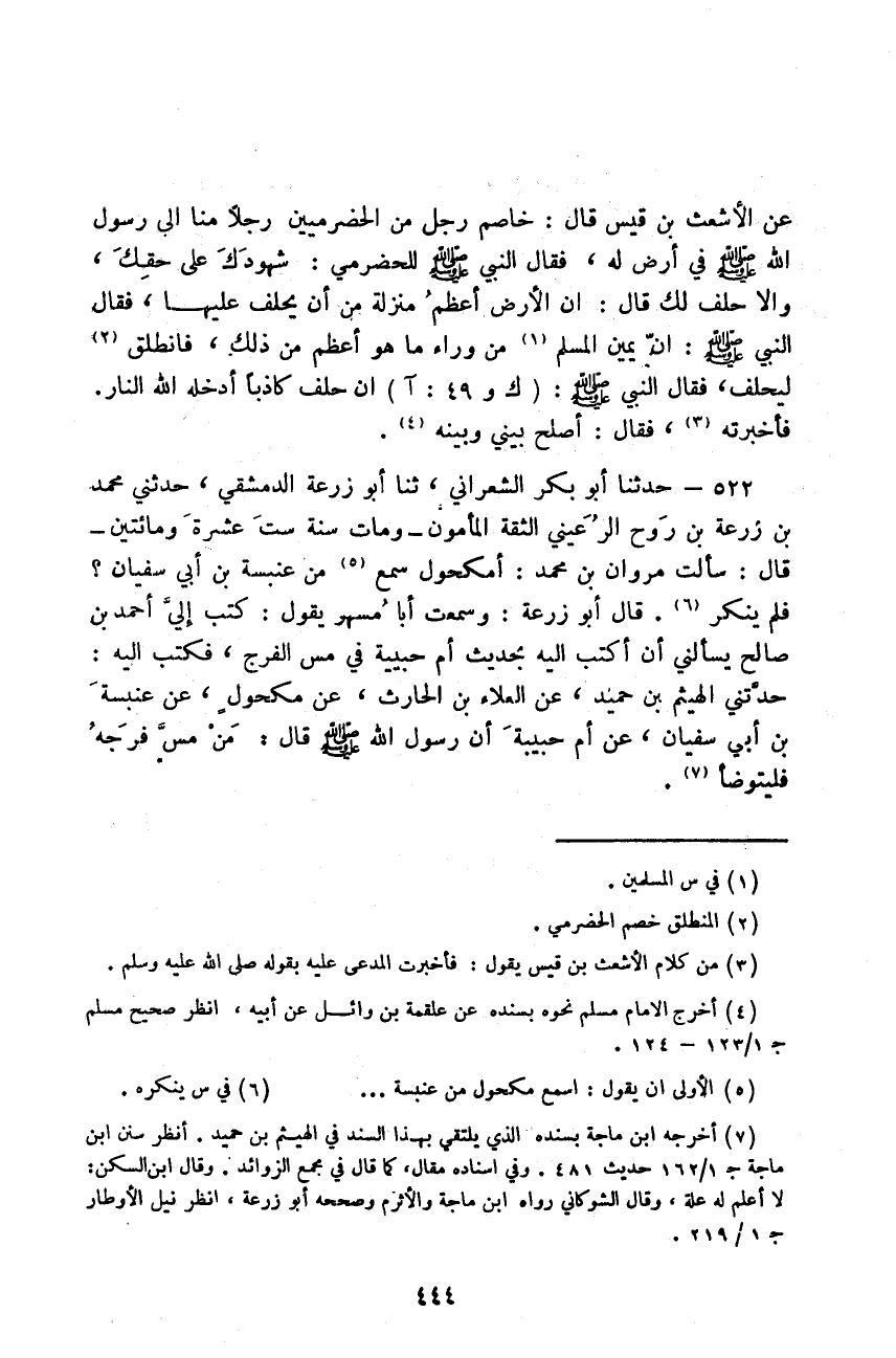 حَدَّثَنَا أَبُو بَكْرٍ الشَّعْرَانِيُّ، ثَنَا أَبُو زُرْعَةَ الدِّمَشْقِيُّ، حَدَّثَنِي مُحَمَّدُ بْنُ زُرْعَةَ بْنِ رَوْحٍ الرُّعَيْنِيُّ الثِّقَةُ الْمَأْمُونُ، وَمَاتَ سَنَةَ سِتَ عَشْرَةَ وَمِائَتَيْنِ، قَالَ: سَأَلْتُ مَرْوَانَ بْنَ مُحَمَّدٍ: أَمَكْحُولٌ سَمِعَ مِنَ عَنْبَسَةِ بْنِ أَبِي سُفْيَانَ؟ فَلَمْ يُنْكِرْ. قَالَ أَبُو زُرْعَةَ: وَسَمِعْتُ أَبَا مُسْهِرٍ، يَقُولُ: كَتَبَ إِلَيَّ أَحْمَدُ بْنُ صَالِحٍ يَسْأَلُنِي أَنْ أَكْتُبَ إِلَيْهِ بِحَدِيثِ أُمِّ حَبِيبَةَ فِي مَسِّ الْفَرَجِ، فَكَتَبَ إِلَيْهِ: حَدَّثَنِي الْهَيْثَمُ بْنُ حُمَيْدٍ، عَنِ الْعَلَاءِ بْنِ الْحَارِثِ، عَنْ مَكْحُولٍ، عَنْ عَنْبَسَةَ بْنِ أَبِي سُفْيَانَ، عَنْ أُمِّ حَبِيبَةَ أَنَّ رَسُولَ اللَّهِ صَلَّى اللهُ عَلَيْهِ وَسَلَّمَ، قَالَ: «§مَنْ مَسَّ فَرْجَهُ فَلْيَتَوَضَّأْ»