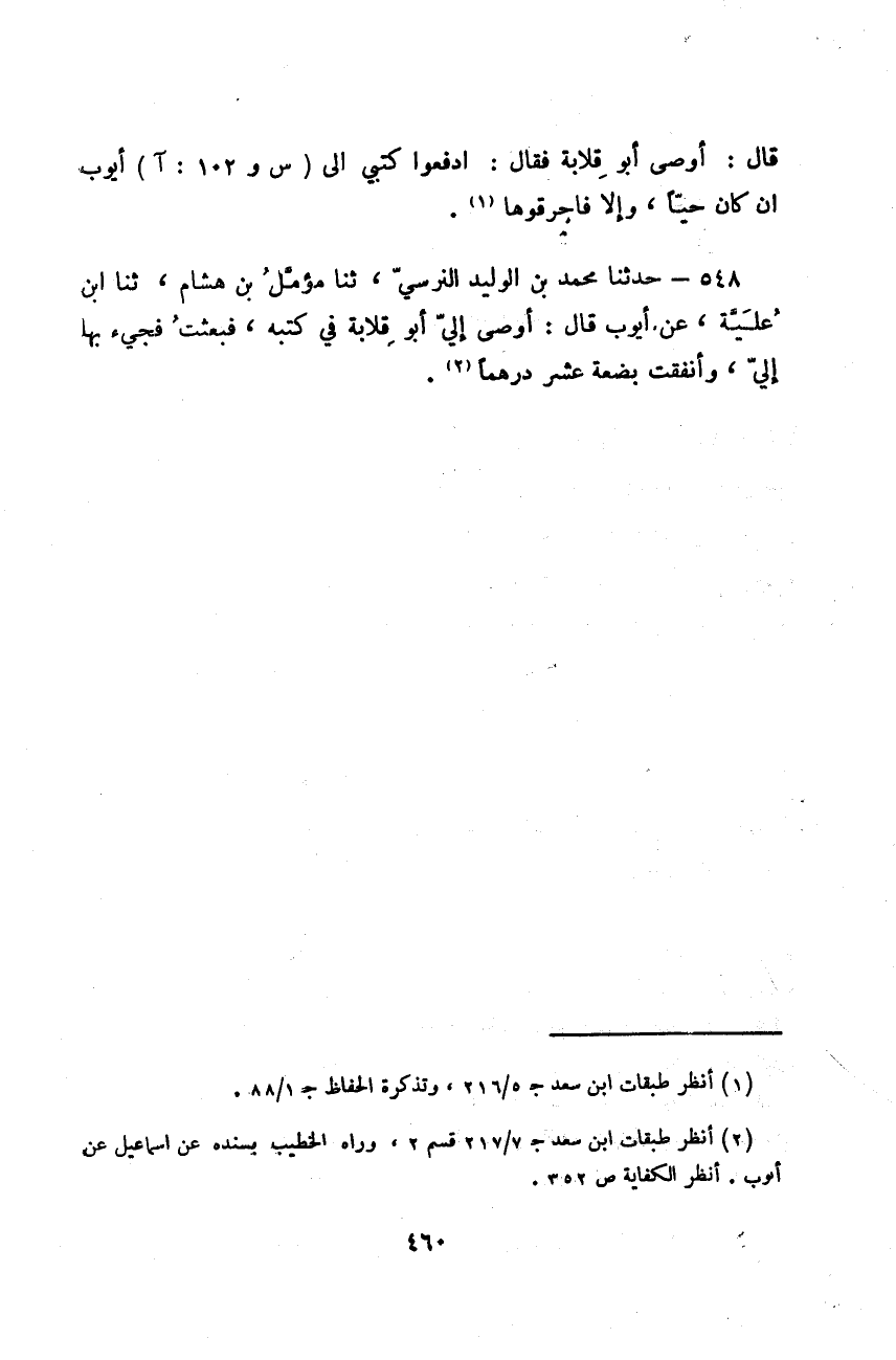 حَدَّثَنَا مُحَمَّدُ بْنُ الْوَلِيدِ النَّرْسِيُّ، ثَنَا مُؤَمَّلُ بْنُ هِشَامٍ، ثَنَا ابْنُ عُلَيَّةَ، عَنْ أَيُّوبَ، قَالَ: «§أَوْصَى إِلَيَّ أَبُو قِلَابَةَ فِي كُتُبِهِ، فَبَعَثْتُ فَجِيءَ بِهَا إِلَيَّ، وَأَنْفَقْتُ بَضْعَةَ عَشَرَ دِرْهَمًا»