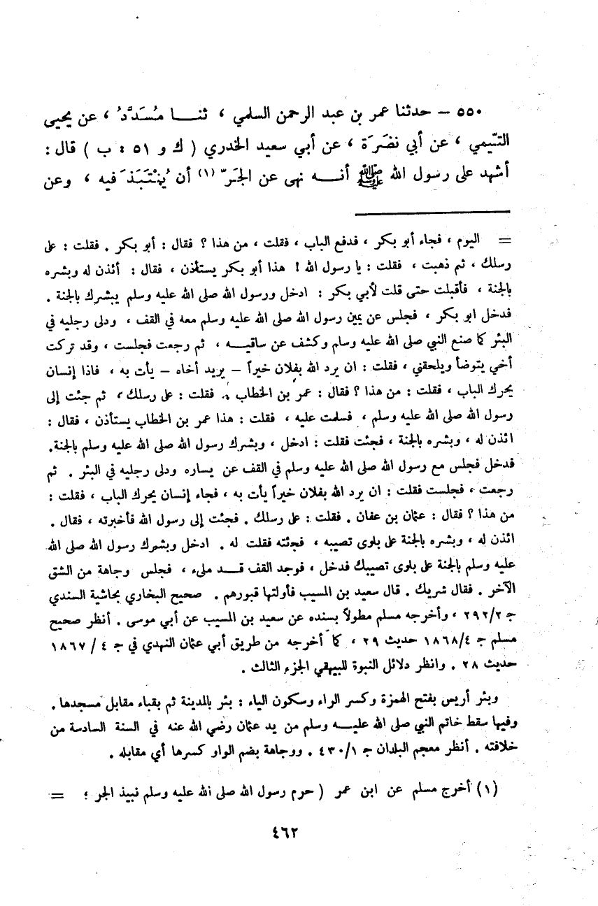 حَدَّثَنَا عُمَرُ بْنُ عَبْدِ الرَّحْمَنِ السُّلَمِيُّ، ثَنَا مُسَدَّدٌ، عَنْ يَحْيَى التَّيْمِيِّ، عَنْ أَبِي نَضْرَةَ، عَنْ أَبِي سَعِيدٍ الْخُدْرِيِّ قَالَ: «أَشْهَدُ عَلَى رَسُولِ اللَّهِ صَلَّى اللهُ عَلَيْهِ وَسَلَّمَ أَنَّهُ §نَهَى عَنِ الْجَرِّ أَنْ يُنْتَبَذَ فِيهِ، وَعَنِ -[463]- الزَّبِيبِ وَالتَّمْرِ أَنْ يُخْلَطَ بَيْنَهُمَا، وَعَنِ الْبُسْرِ وَالتَّمْرِ أَنْ يُخْلَطَ بَيْنَهُمَا»