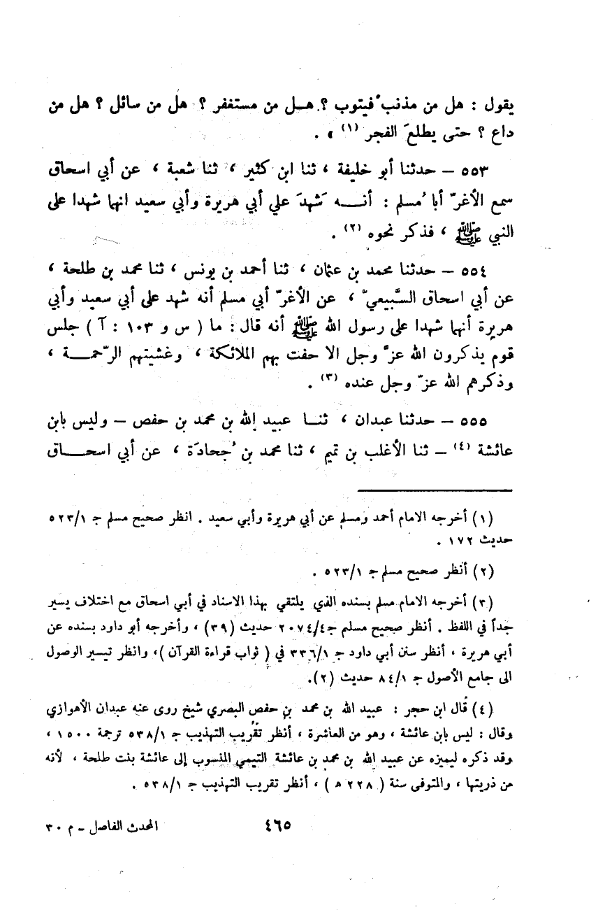 حَدَّثَنَا مُحَمَّدُ بْنُ عُثْمَانَ، ثَنَا أَحْمَدُ بْنُ يُونُسَ، ثَنَا مُحَمَّدُ بْنُ طَلْحَةَ، عَنْ أَبِي إِسْحَاقَ السَّبِيعِيِّ، عَنِ الْأَغَرِّ أَبِي مُسْلِمٍ أَنَّهُ شَهِدَ عَلَى أَبِي سَعِيدٍ وَأَبِي هُرَيْرَةَ أَنَّهُمَا شَهِدَا عَلَى رَسُولِ اللَّهِ صَلَّى اللهُ عَلَيْهِ وَسَلَّمَ أَنَّهُ قَالَ: «§مَا جَلَسَ قَوْمٌ يَذْكُرُونَ اللَّهَ عَزَّ وَجَلَّ إِلَّا حَفَّتْ بِهِمُ الْمَلَائِكَةُ، وَغَشِيَتْهُمُ الرَّحْمَةُ، وَذَكَرَهُمُ اللَّهُ عَزَّ وَجَلَّ عِنْدَهُ»