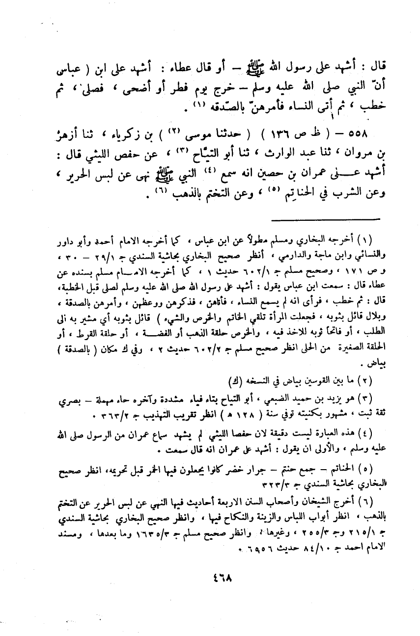 حَدَّثَنَا مُوسَى بْنُ زَكَرِيَّاءَ، ثَنَا أَزْهَرُ بْنُ مَرْوَانَ، ثَنَا عَبْدُ الْوَارِثِ، ثَنَا أَبُو التَّيَّاحِ، عَنْ حَفْصٍ اللَّيْثِيِّ قَالَ: أَشْهَدُ عَلَى عِمْرَانَ بْنِ حُصَيْنٍ: «أَنَّهُ سَمِعَ النَّبِيَّ صَلَّى اللهُ عَلَيْهِ وَسَلَّمَ §نَهَى عَنْ لُبْسِ الْحَرِيرِ، وَعَنِ الشُّرْبِ فِي الْحَنَاتِمِ، وَعَنِ التَّخَتُّمِ بِالذَّهَبِ»