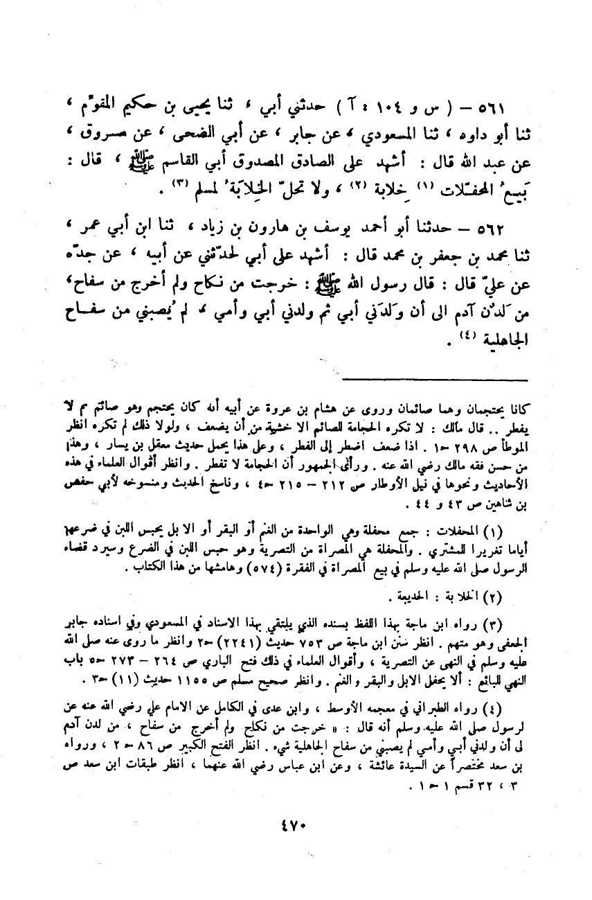 حَدَّثَنِي أَبِي، ثَنَا يَحْيَى بْنُ حَكِيمٍ الْمُقَوِّمُ، ثَنَا أَبُو دَاوُدَ، ثَنَا الْمَسْعُودِيُّ، عَنْ جَابِرٍ، عَنْ أَبِي الضُّحَى، عَنْ مَسْرُوقٍ، عَنْ عَبْدِ اللَّهِ، قَالَ: أَشْهَدُ عَلَى الصَّادِقِ الْمَصْدُوقِ أَبِي الْقَاسِمِ صَلَّى اللهُ عَلَيْهِ وَسَلَّمَ قَالَ: «§بَيْعُ الْمُحَفَّلَاتِ خِلَابَةٌ، وَلَا تَحِلُّ الْخِلَابَةُ لِمُسْلِمٍ»