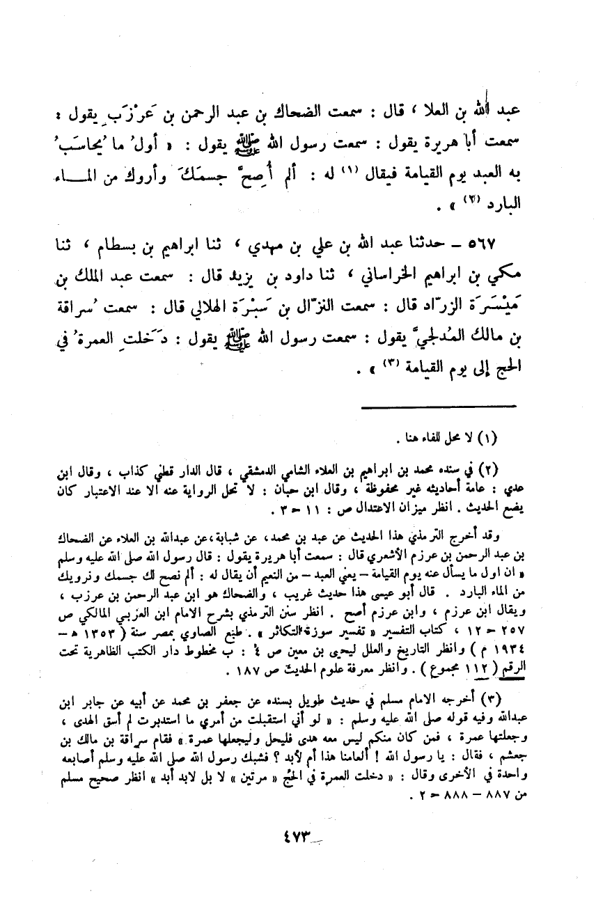 حَدَّثَنَا عَبْدُ اللَّهِ بْنُ عَلِيِّ بْنِ مَهْدِيٍّ، ثَنَا إِبْرَاهِيمُ بْنُ بِسْطَامٍ، ثَنَا مَكِّيُّ بْنُ إِبْرَاهِيمَ الْخُرَاسَانِيُّ، ثَنَا دَاوُدُ بْنُ يَزِيدَ، قَالَ: سَمِعْتُ عَبْدَ الْمَلِكِ بْنَ مَيْسَرَةَ الزَّرَّادَ قَالَ: سَمِعْتُ النَّزَّالَ بْنَ سَبْرَةَ الْهِلَالِيُّ، قَالَ: سَمِعْتُ سُرَاقَةَ بْنَ مَالِكٍ الْمُدْلِجِيَّ يَقُولُ: سَمِعْتُ رَسُولَ اللَّهِ صَلَّى اللهُ عَلَيْهِ وَسَلَّمَ يَقُولُ: «§دَخَلَتِ الْعُمْرَةُ فِي الْحَجِّ إِلَى يَوْمِ الْقِيَامَةِ»