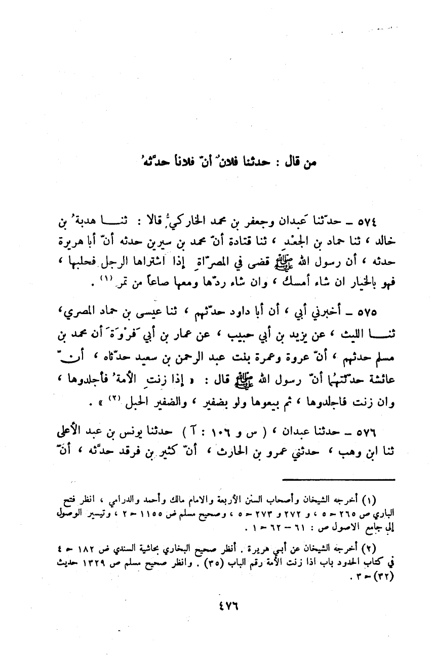 أَخْبَرَنِي أَبِي، أَنَّ أَبَا دَاوُدَ حَدَّثَهُمْ، ثَنَا عِيسَى بْنُ حَمَّادٍ الْمِصْرِيُّ، ثَنَا اللَّيْثُ، عَنْ يَزِيدَ بْنِ أَبِي حَبِيبٍ، عَنْ عَمَّارِ بْنِ أَبِي فَرْوَةَ، أَنَّ مُحَمَّدَ بْنَ مُسْلِمٍ، حَدَّثَهُمْ، أَنَّ عُرْوَةَ وَعَمْرَةَ بِنْتَ عَبْدِ الرَّحْمَنِ بْنِ سَعْدٍ حَدَّثَاهُ أَنَّ عَائِشَةَ حَدَّثَتْهُمَا أَنَّ رَسُولَ اللَّهِ صَلَّى اللهُ عَلَيْهِ وَسَلَّمَ قَالَ: «§إِذَا زَنَتِ الْأَمَةُ فَأَجْلِدُوهَا، وَإِنْ زَنَتْ فَاجْلِدُوهَا، ثُمَّ بِيعُوهَا وَلَوْ بِضَفِيرٍ» وَالضَّفِيرُ: الْحَبْلُ