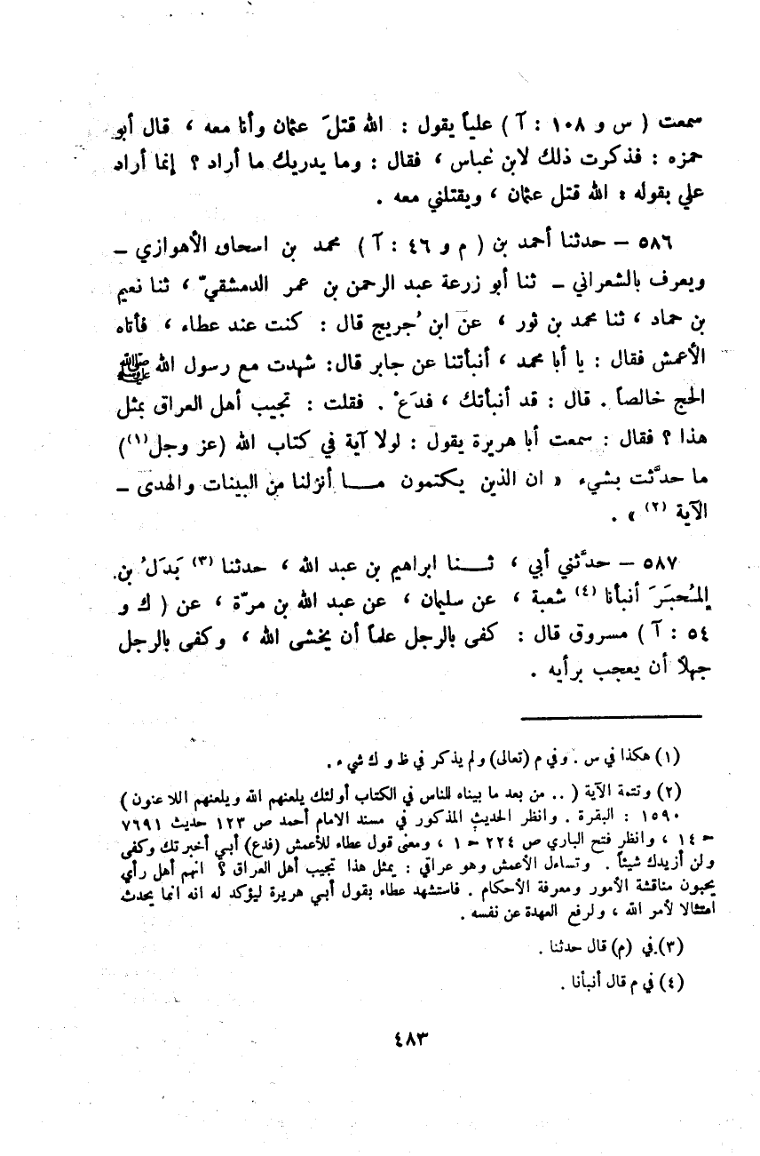 حَدَّثَنَا أَحْمَدُ بْنُ مُحَمَّدِ بْنِ إِسْحَاقَ الْأَهْوَازِيُّ وَيُعْرَفُ بِالشَّعْرَانِيِّ، ثَنَا أَبُو زُرْعَةَ عَبْدُ الرَّحْمَنِ بْنُ عُمَرَ الدِّمَشْقِيُّ، ثَنَا نُعَيْمُ بْنُ حَمَّادٍ، ثَنَا مُحَمَّدُ بْنُ ثَوْرٍ، عَنِ ابْنِ جُرَيْجٍ قَالَ: كُنْتُ عِنْدَ عَطَاءٍ، فَأَتَاهُ الْأَعْمَشُ فَقَالَ: يَا أَبَا مُحَمَّدٍ، أَنْبَأْتَنَا عَنْ جَابِرٍ قَالَ: " §شَهِدْتُ مَعَ رَسُولِ اللَّهِ صَلَّى اللهُ عَلَيْهِ وَسَلَّمَ الْحَجَّ خَالِصًا قَالَ: قَدْ أَنْبَأْتُكَ، فَدَعْ فَقُلْتُ: تُجِيبُ أَهْلَ الْعِرَاقِ بِمِثْلِ هَذَا؟ فَقَالَ: سَمِعْتُ أَبَا هُرَيْرَةَ يَقُولُ: " لَوْلَا آيَةٌ فِي كِتَابِ اللَّهِ عَزَّ وَجَلَّ مَا حَدَّثْتُ بِشَيْءٍ: {إِنَّ الَّذِينَ يَكْتُمُونَ مَا أَنْزَلْنَا مِنَ الْبَيِّنَاتِ وَالْهُدَى} [البقرة: 159] الْآيَةَ "