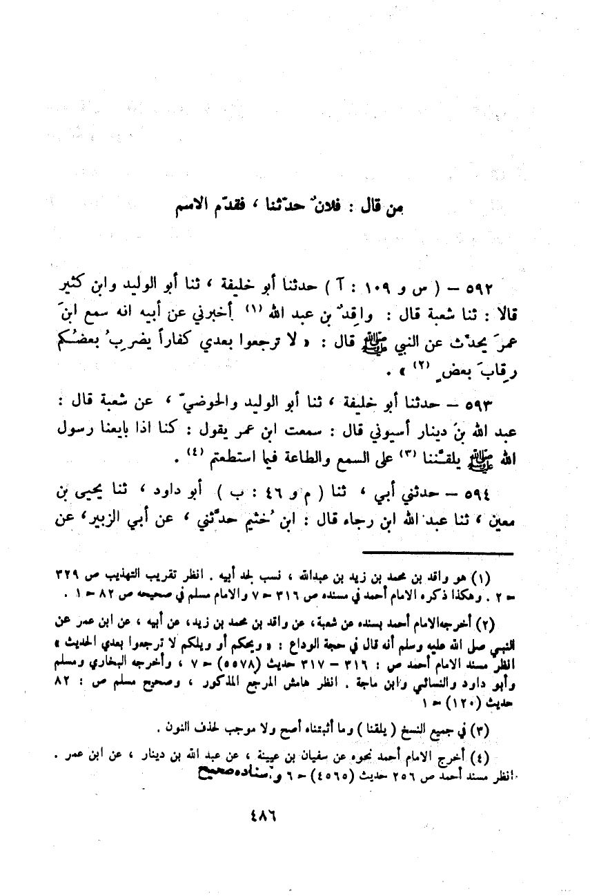 حَدَّثَنَا أَبُو خَلِيفَةَ، ثَنَا أَبُو الْوَلِيدِ، وَابْنُ كَثِيرٍ، قَالَا: ثَنَا شُعْبَةُ قَالَ: وَاقِدُ بْنُ عَبْدِ اللَّهِ أَخْبَرَنِي عَنْ أَبِيهِ، أَنَّهُ سَمِعَ ابْنَ عُمَرَ، يُحَدِّثُ، عَنِ النَّبِيِّ صَلَّى اللهُ عَلَيْهِ وَسَلَّمَ قَالَ: «§لَا تَرْجِعُوا بَعْدِي كُفَّارًا يَضْرِبُ بَعْضُكُمْ رِقَابَ بَعْضٍ»
