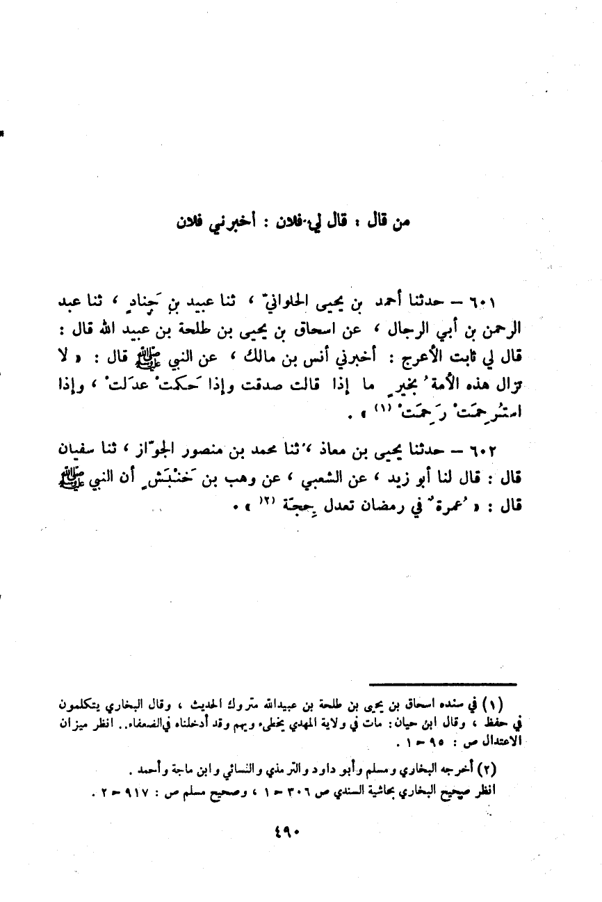 حَدَّثَنَا أَحْمَدُ بْنُ يَحْيَى الْحُلْوَانِيُّ، ثَنَا عُبَيْدُ بْنُ جَنَّادٍ، ثَنَا عَبْدُ الرَّحْمَنِ بْنُ أَبِي الرِّجَالِ، عَنْ إِسْحَاقَ بْنِ يَحْيَى بْنِ طَلْحَةَ بْنِ عُبَيْدِ اللَّهِ قَالَ: قَالَ لِي ثَابِتٌ الْأَعْرَجُ، أَخْبَرَنِي أَنَسُ بْنُ مَالِكٍ عَنِ النَّبِيِّ صَلَّى اللهُ عَلَيْهِ وَسَلَّمَ قَالَ: «§لَا تَزَالُ هَذِهِ الْأُمَّةُ بِخَيْرٍ، مَا إِذَا قَالَتْ صَدَقَتْ وَإِذَا حَكَمَتْ عَدَلَتْ، وَإِذَا اسْتُرْحِمَتْ رَحِمَتْ»