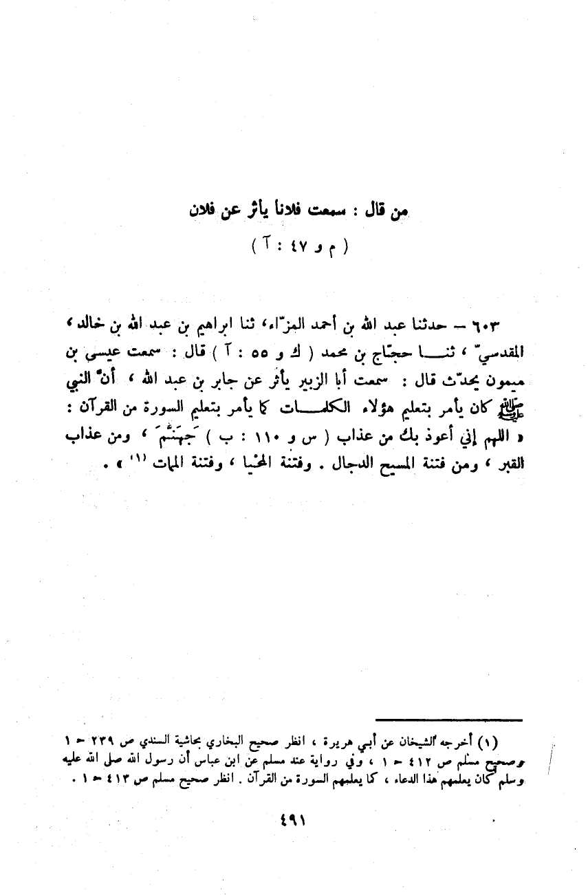 حَدَّثَنَا عَبْدُ اللَّهِ بْنُ أَحْمَدَ الْمُزَّاءُ، ثَنَا إِبْرَاهِيمُ بْنُ عَبْدِ اللَّهِ بْنِ خَالِدٍ الْمَقْدِسِيُّ، ثَنَا حَجَّاجُ بْنُ مُحَمَّدٍ، قَالَ: سَمِعْتُ عِيسَى بْنَ مَيْمُونٍ، يُحَدِّثُ قَالَ: سَمِعْتُ أَبَا الزُّبَيْرِ، يَأْثُرُ عَنْ جَابِرِ بْنِ عَبْدِ اللَّهِ، أَنَّ النَّبِيَّ صَلَّى اللهُ عَلَيْهِ وَسَلَّمَ كَانَ §يَأْمُرُ بِتَعْلِيمِ هَؤُلَاءِ الْكَلِمَاتِ، كَمَا يَأْمُرُ بِتَعْلِيمِ السُّورَةِ مِنَ الْقُرْآنِ: «اللَّهُمَّ إِنِّي أَعُوذُ بِكَ مِنْ عَذَابِ جَهَنَّمَ، وَمِنْ عَذَابِ الْقَبْرِ، وَمِنْ فِتْنَةِ الْمَسِيحِ الدَّجَّالِ، وَفِتْنَةِ الْمَحْيَا، وَفِتْنَةِ الْمَمَاتِ»