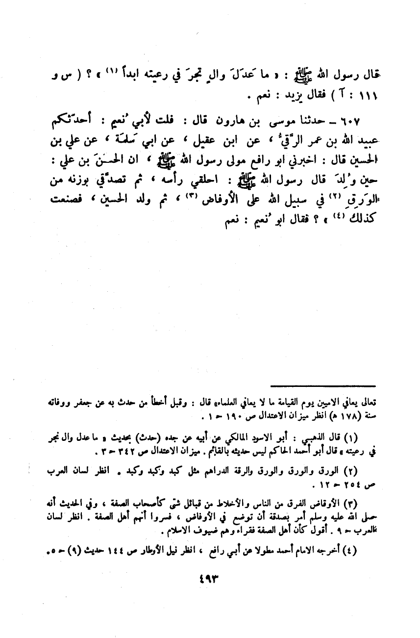 حَدَّثَنَا مُوسَى بْنُ هَارُونَ، قَالَ: قُلْتُ لِأَبِي نُعَيْمٍ: أَحَدَّثَكُمْ عُبَيْدُ اللَّهِ بْنُ عُمَرَ الرَّقِّيُّ، عَنِ ابْنِ عَقِيلٍ، عَنْ أَبِي سَلَمَةَ، عَنْ عَلِيِّ بْنِ الْحُسَيْنِ، قَالَ: أَخْبَرَنِي أَبُو رَافِعٍ مَوْلَى رَسُولِ اللَّهِ صَلَّى اللهُ عَلَيْهِ وَسَلَّمَ أَنَّ الْحَسَنَ بْنَ عَلِيٍّ: §حِينَ وُلِدَ، قَالَ رَسُولُ اللَّهِ صَلَّى اللهُ عَلَيْهِ وَسَلَّمَ: «احْلِقِي رَأْسَهُ، ثُمَّ تَصَدَّقِي بِوَزْنِهِ مِنَ الْوَرِقِ فِي سَبِيلِ اللَّهِ عَلَى الْأَوْفَاضِ» ثُمَّ وُلِدَ الْحُسَيْنُ، فَصَنَعَتْ كَذَلِكَ؟ فَقَالَ أَبُو نُعَيْمٍ: نَعَمْ