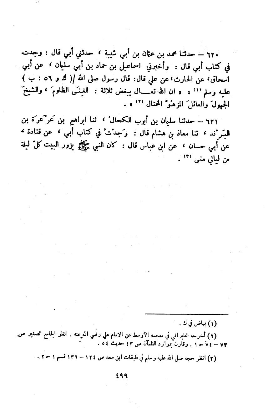 حَدَّثَنَا مُحَمَّدُ بْنُ عُثْمَانَ بْنِ أَبِي شَيْبَةَ، حَدَّثَنِي أَبِي قَالَ: وَجَدْتُ فِي كِتَابِ أَبِي، قَالَ: وَأَخْبَرَنِي إِسْمَاعِيلُ بْنُ حَمَّادِ بْنِ أَبِي سُلَيْمَانَ، عَنْ أَبِي إِسْحَاقَ، عَنِ الْحَارِثِ، عَنْ عَلِيٍّ قَالَ: قَالَ رَسُولُ اللَّهِ صَلَّى اللهُ عَلَيْهِ وَسَلَّمَ: " إِنَّ اللَّهَ تَعَالَى §يَبْغَضُ ثَلَاثَةً: الْغِنَيَّ الظَّلُومَ، وَالشَّيْخَ الْجَهُولَ، وَالْعَائِلَ الْمَزْهُوَّ الْمُخْتَالَ "