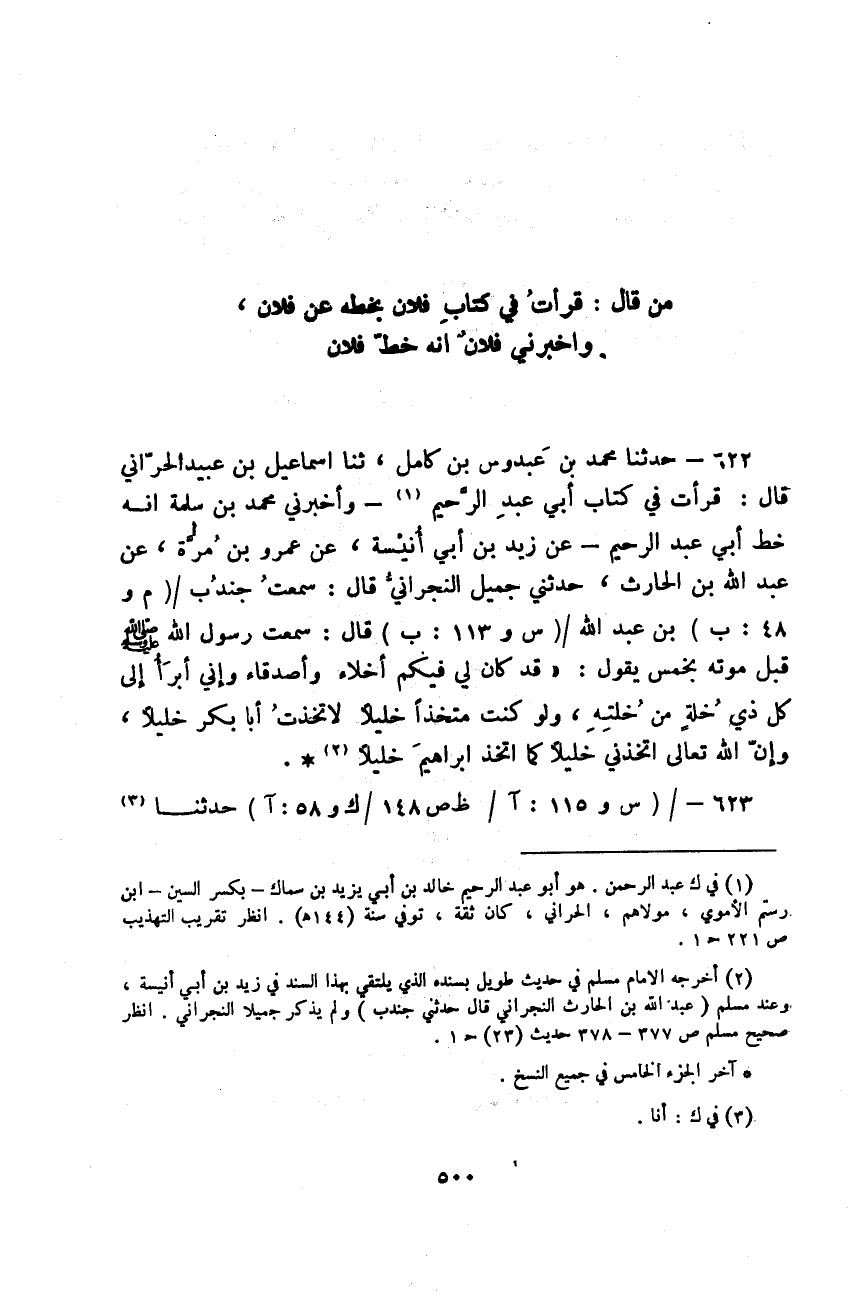 حَدَّثَنَا مُحَمَّدُ بْنُ عَبْدُوسَ بْنِ كَامِلٍ، ثَنَا إِسْمَاعِيلُ بْنُ عُبَيْدٍ الْحَرَّانِيُّ قَالَ: قَرَأْتُ فِي كِتَابِ أَبِي عَبْدِ الرَّحِيمِ - وَأَخْبَرَنِي مُحَمَّدُ بْنُ سَلَمَةَ أَنَّهُ خَطُّ أَبِي عَبْدِ الرَّحِيمِ -: عَنْ زَيْدِ بْنِ أَبِي أُنَيْسَةَ، عَنْ عَمْرِو بْنِ مُرَّةَ، عَنْ عَبْدِ اللَّهِ بْنِ الْحَارِثِ حَدَّثَنِي جَمِيلٌ النَّجْرَانِيُّ قَالَ: سَمِعْتُ جُنْدُبَ بْنَ عَبْدِ اللَّهِ قَالَ: سَمِعْتُ رَسُولَ اللَّهِ صَلَّى اللهُ عَلَيْهِ وَسَلَّمَ قَبْلَ مَوْتِهِ بِخَمْسٍ يَقُولُ: «§قَدْ كَانَ لِي فِيكُمْ أَخِلَّاءُ وَأَصْدِقَاءُ وَإِنِّي أَبْرَأُ إِلَى كُلِّ ذِي خِلَّةٍ مِنْ خُلَّتِهِ، وَلَوْ كُنْتُ مُتَّخِذًا خَلِيلًا لَاتَّخَذْتُ أَبَا بَكْرٍ خَلِيلًا، وَإِنَّ اللَّهَ تَعَالَى اتَّخَذَنِي خَلِيلًا كَمَا اتَّخَذَ إِبْرَاهِيمَ خَلِيلًا»