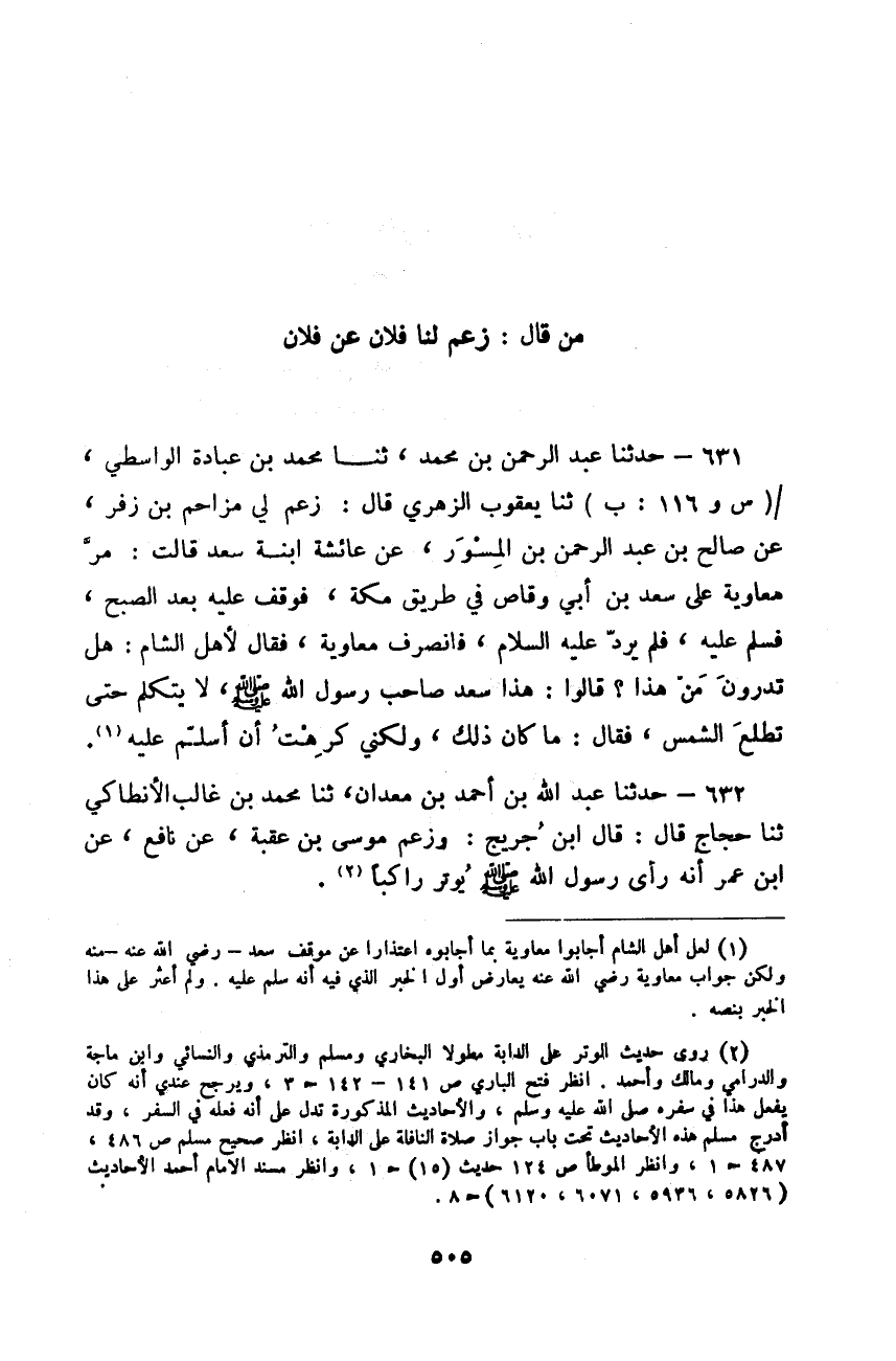 حَدَّثَنَا عَبْدُ الرَّحْمَنِ بْنُ مُحَمَّدٍ، ثَنَا مُحَمَّدُ بْنُ عُبَادَةَ الْوَاسِطِيُّ، ثَنَا يَعْقُوبُ الزُّهْرِيُّ قَالَ: زَعَمَ لِي مُزَاحِمُ بْنُ زُفَرَ، عَنْ صَالِحِ بْنِ عَبْدِ الرَّحْمَنِ بْنِ الْمِسْوَرِ، عَنْ عَائِشَةَ ابْنَةِ سَعْدٍ، قَالَتْ: " مَرَّ مُعَاوِيَةُ عَلَى سَعْدِ بْنِ أَبِي وَقَّاصٍ فِي طَرِيقِ مَكَّةَ، فَوَقَفَ عَلَيْهِ بَعْدَ الصُّبْحِ، فَسَلَّمَ عَلَيْهِ، فَلَمْ يَرُدَّ عَلَيْهِ السَّلَامُ، فَانْصَرَفَ مُعَاوِيَةُ، فَقَالَ لِأَهْلِ الشَّامِ: هَلْ تَدْرُونَ مَنْ هَذَا؟ قَالُوا: هَذَا سَعْدٌ صَاحِبُ رَسُولِ اللَّهِ صَلَّى اللهُ عَلَيْهِ وَسَلَّمَ، §لَا يَتَكَلَّمُ حَتَّى تَطْلُعَ الشَّمْسُ فَقَالَ: مَا كَانَ ذَلِكَ، وَلَكِنِّي كَرِهْتُ أَنْ أُسَلِّمَ عَلَيْهِ "