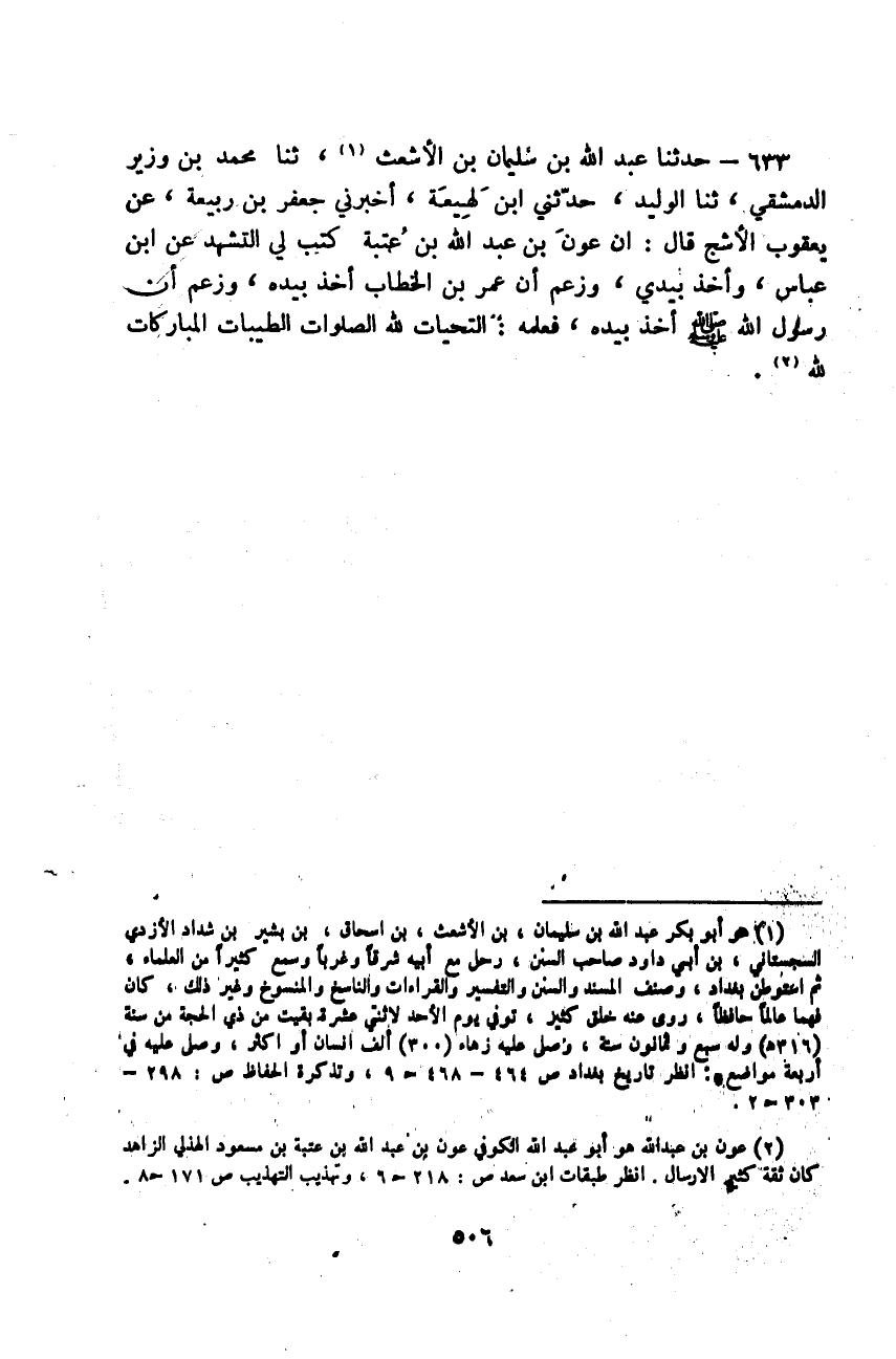 حَدَّثَنَا عَبْدُ اللَّهِ بْنُ سُلَيْمَانَ بْنِ الْأَشْعَثِ، ثَنَا مُحَمَّدُ بْنُ وَزِيرٍ الدِّمَشْقِيُّ، ثَنَا الْوَلِيدُ، حَدَّثَنِي ابْنُ لَهِيعَةَ، أَخْبَرَنِي جَعْفَرُ بْنُ رَبِيعَةَ، عَنْ يَعْقُوبَ الْأَشَجِّ قَالَ: إِنَّ عَوْنَ بْنَ عَبْدِ اللَّهِ بْنِ عُتْبَةَ، كَتَبَ لِي التَّشَهُّدَ، عَنِ ابْنِ عَبَّاسٍ، وَأَخَذَ بِيَدِي، وَزَعَمَ أَنَّ عُمَرَ بْنَ الْخَطَّابِ، أَخَذَ بِيَدِهِ، وَزَعَمَ أَنَّ رَسُولَ اللَّهِ صَلَّى اللهُ عَلَيْهِ وَسَلَّمَ أَخَذَ بِيَدِهِ §فَعَلَّمَهُ: «التَّحِيَّاتُ لِلَّهِ الصَّلَوَاتُ الطَّيِّبَاتُ الْمُبَارَكَاتُ لِلَّهِ»
