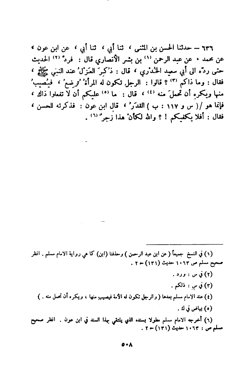 حَدَّثَنَا الْحَسَنُ بْنُ الْمُثَنَّى، ثَنَا أَبِي، ثَنَا أَبِي، عَنِ ابْنِ عَوْنٍ، عَنْ مُحَمَّدٍ، عَنْ عَبْدِ الرَّحْمَنِ بْنِ بِشْرٍ الْأَنْصَارِيِّ، قَالَ: فَرَدَّ الْحَدِيثَ حَتَّى رَدَّهُ إِلَى أَبِي سَعِيدٍ الْخُدْرِيِّ قَالَ: §ذُكِرَ الْعَزْلُ عِنْدَ النَّبِيِّ صَلَّى اللهُ عَلَيْهِ وَسَلَّمَ فَقَالَ: «وَمَا ذَاكُمْ؟» قَالُوا: الرَّجُلُ تَكُونُ لَهُ الْمَرْأَةُ ترضعُ فَيُصِيبُ مِنْهَا وَيَكْرَهُ أَنْ تَحْمِلَ مِنْهُ، قَالَ: «مَا عَلَيْكُمْ أَنْ لَا تَفْعَلُوا ذَاكَ، فَإِنَّمَا هُوَ الْقَدَرُ» قَالَ ابْنُ عَوْنٍ: فَذَكَرْتُهُ لِلْحَسَنِ، فَقَالَ: أَفَلَا يَكْفِيكُمْ وَاللَّهِ لَكَأَنَّ هَذَا زَجْرٌ