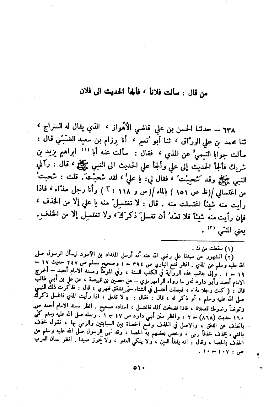 حَدَّثَنَا الْحَسَنُ بْنُ عَلِيٍّ، قَاضِي الْأَهْوَازِ، الَّذِي يُقَالُ لَهُ السَّرَّاجُ، ثَنَا مُحَمَّدُ بْنُ عَلِيٍّ الْوَرَّاقُ، ثَنَا أَبُو نُعَيْمٍ، أَنَا رِزَامُ بْنُ سَعِيدٍ الضَّبِّيُّ، قَالَ: سَأَلْتُ جَوَابًا التَّيْمِيَّ عَنِ الْمَذْيِ، فَقَالَ: سَأَلْتُ عَنْهُ أَبَا إِبْرَاهِيمَ يَزِيدَ بْنِ شَرِيكٍ فَأَلْجَأَ الْحَدِيثَ إِلَى عَلِيٍّ وَأَلْجَأَ عَلِيٌّ الْحَدِيثَ إِلَى النَّبِيِّ صَلَّى اللهُ عَلَيْهِ وَسَلَّمَ قَالَ: رَآنِي النَّبِيُّ صَلَّى اللهُ عَلَيْهِ وَسَلَّمَ وَقَدْ شَحِبْتُ فَقَالَ لِي: «يَا عَلِيُّ، لَقَدْ شَحِبْتَ» قُلْتُ: شَحِبْتُ مِنِ اغْتِسَالِي بِالْمَاءِ، وَأَنَا رَجُلٌ مَذَّاءٌ، فَإِذَا رَأَيْتُ مِنْهُ شَيْئًا اغْتَسَلْتُ مِنْهُ قَالَ: «لَا تَغْتَسِلْ مِنْهُ يَا عَلِيُّ إِلَّا مِنَ الْخَذْفِ، فَإِنْ رَأَيْتَ مِنْهُ شَيْئًا فَلَا تَعُدْ أَنْ تَغْسِلَ ذَكَرَكَ، §وَلَا تَغْتَسِلْ إِلَّا مِنَ الْخَذْفِ» يَعْنِي الْمَنِيَّ