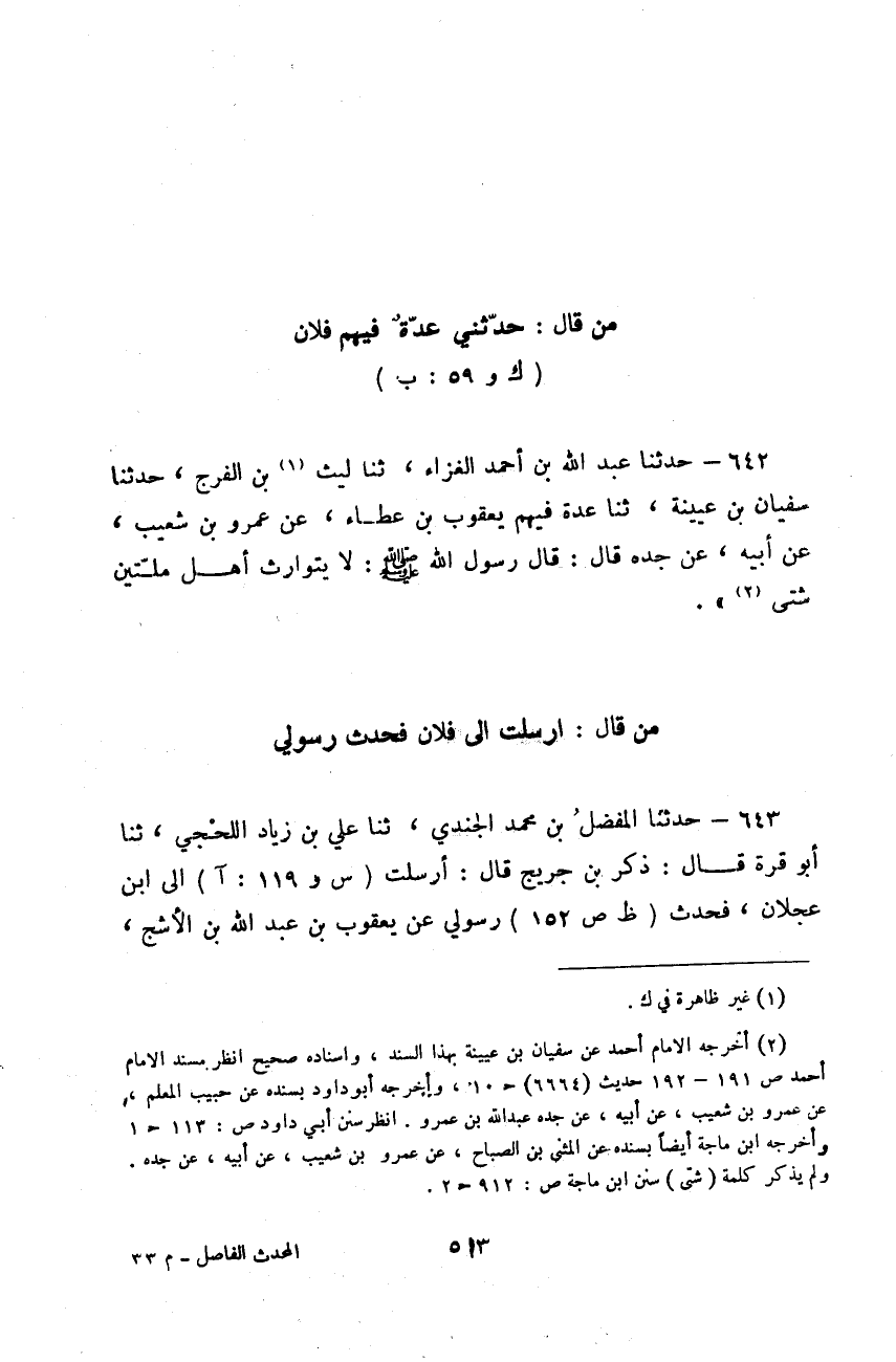 حَدَّثَنَا عَبْدُ اللَّهِ بْنُ أَحْمَدَ الْغَزَّاءُ، ثَنَا لَيْثُ بْنُ الْفَرَجِ، حَدَّثَنَا سُفْيَانُ بْنُ عُيَيْنَةَ، ثَنَا عِدَّةٌ فِيهِمْ يَعْقُوبُ بْنُ عَطَاءٍ، عَنْ عَمْرِو بْنِ شُعَيْبٍ، عَنْ أَبِيهِ، عَنْ جَدِّهِ قَالَ: قَالَ رَسُولُ اللَّهِ صَلَّى اللهُ عَلَيْهِ وَسَلَّمَ: «§لَا يَتَوَارَثُ أَهْلُ مِلَّتَيْنِ شَتَّى»