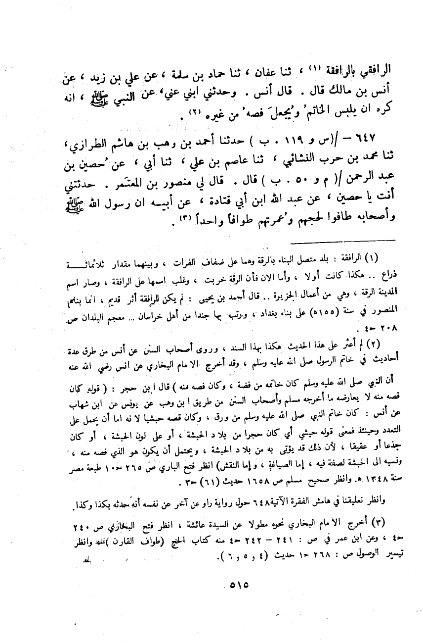حَدَّثَنَا أَحْمَدُ بْنُ وَهْبِ بْنِ هَاشِمٍ الطَّرَازِيُّ، ثَنَا مُحَمَّدُ بْنُ حَرْبٍ النَّشَائِيُّ، ثَنَا عَاصِمُ بْنُ عَلِيٍّ، ثَنَا أَبِي، عَنْ حُصَيْنِ بْنِ عَبْدِ الرَّحْمَنِ، قَالَ: قَالَ لِي مَنْصُورُ بْنُ الْمُعْتَمِرِ، حَدَّثْتَنِي أَنْتَ يَا حُصَيْنُ، عَنْ عَبْدِ اللَّهِ بْنِ أَبِي قَتَادَةَ، عَنْ أَبِيهِ،: «أَنَّ رَسُولَ اللَّهِ صَلَّى اللهُ عَلَيْهِ وَسَلَّمَ وَأَصْحَابَهُ §طَافُوا لِحَجِّهِمْ وَعُمْرَتِهِمْ طَوَافًا وَاحِدًا»