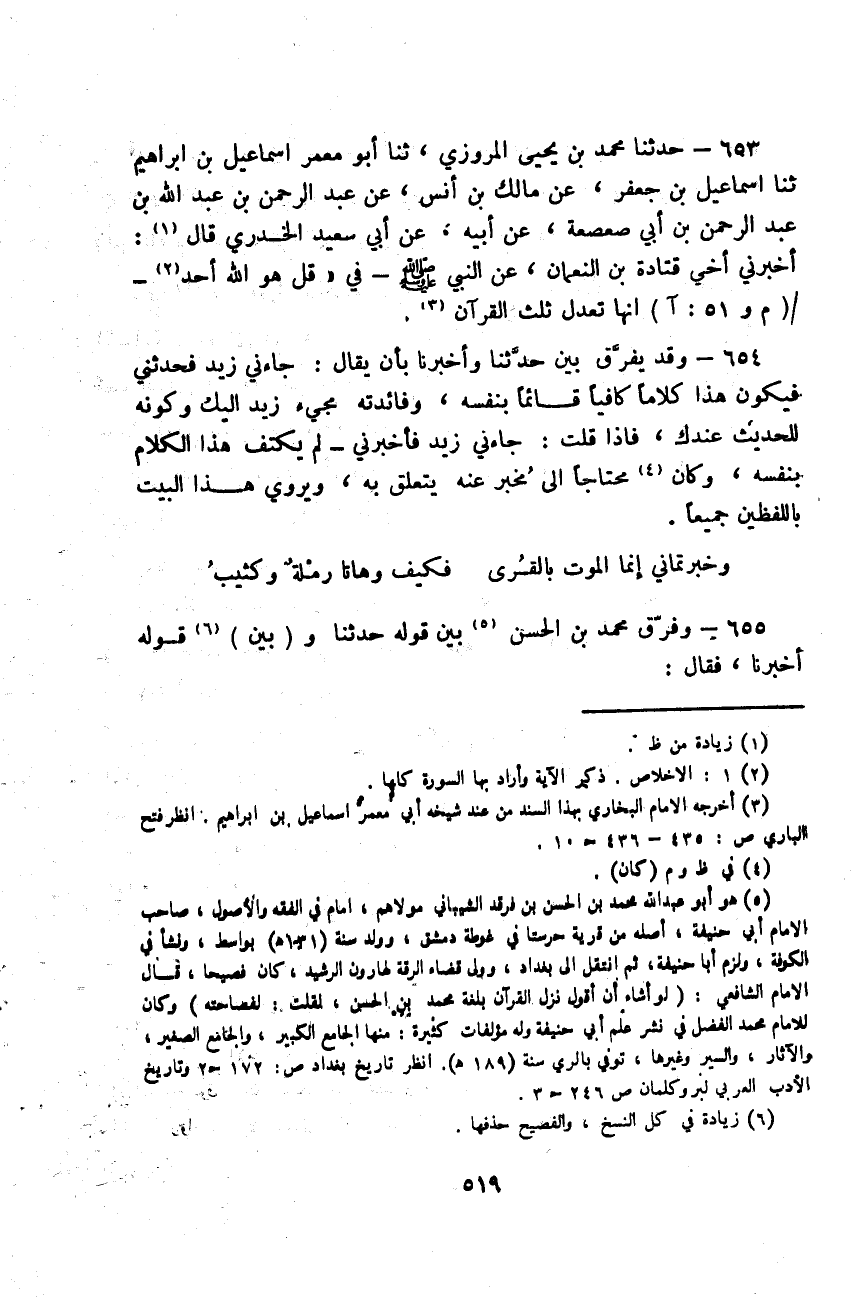 حَدَّثَنَا مُحَمَّدُ بْنُ يَحْيَى الْمَرْوَزِيُّ، ثَنَا أَبُو مَعْمَرٍ إِسْمَاعِيلُ بْنُ إِبْرَاهِيمَ، ثَنَا إِسْمَاعِيلُ بْنُ جَعْفَرٍ، عَنْ مَالِكِ بْنِ أَنَسٍ، عَنْ عَبْدِ الرَّحْمَنِ بْنِ عَبْدِ اللَّهِ بْنِ عَبْدِ الرَّحْمَنِ بْنِ أَبِي صَعْصَعَةَ، عَنْ أَبِيهِ، عَنْ أَبِي سَعِيدٍ الْخُدْرِيِّ قَالَ: أَخْبَرَنِي أَخِي قَتَادَةُ بْنُ النُّعْمَانِ، عَنِ النَّبيِّ صَلَّى اللهُ عَلَيْهِ وَسَلَّمَ فِي قُلْ هُوَ اللَّهُ أَحَدٌ: «إِنَّهَا §تَعْدِلُ ثُلُثَ الْقُرْآنِ» وَقَدْ يُفَرَّقُ بَيْنَ حَدَّثَنَا وَأَخْبَرَنَا بِأَنْ يُقَالَ: جَاءَنِي زَيْدٌ فَحَدَّثَنِي فَيَكُونُ هَذَا كَلَامًا كَافِيًا قَائِمًا بِنَفْسِهِ، وَفَائِدَتُهُ مَجِيءُ زَيْدٍ إِلَيْكَ وَكَوْنُهُ لِلْحَدِيثِ عِنْدَكَ، فَإِذَا قُلْتَ: جَاءَنِي زَيْدٌ، فَأَخْبَرَنِي لَمْ يَكْتَفِ هَذَا الْكَلَامُ بِنَفْسِهِ، وَكَانَ مُحْتَاجًا إِلَى مُخْبَرٍ عَنْهُ يَتَعَلَّقُ بِهِ، وَيُرْوَى هَذَا الْبَيْتُ بِاللَّفْظَيْنِ جَمِيعًا: