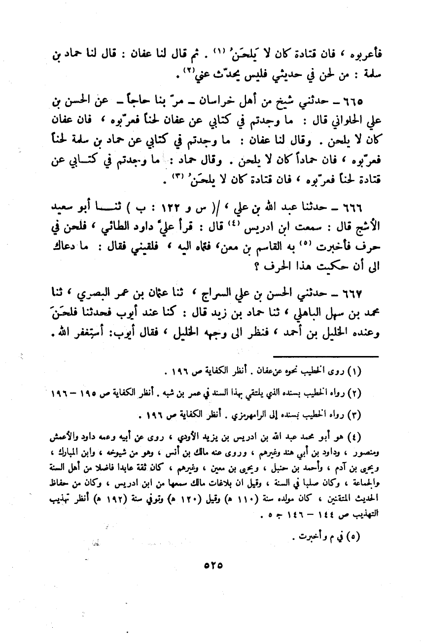 حَدَّثَنِي شَيْخٌ مِنْ أَهْلِ خُرَاسَانَ مَرَّ بِنَا حَاجًّا، عَنِ الْحَسَنِ بْنِ عَلِيِّ الْحُلْوَانِيِّ، قَالَ: «§مَا وَجَدْتُمْ فِي كِتَابِي، عَنْ عَفَّانَ لَحْنًا فَعَرِّبُوهُ، فَإِنَّ عَفَّانَ كَانَ لَا يَلْحَنُ» وَقَالَ لَنَا عَفَّانُ: «مَا وَجَدْتُمْ فِي كِتَابِي، عَنْ حَمَّادِ بْنِ سَلَمَةَ لَحْنًا فَعَرِّبُوهُ، فَإِنَّ حَمَّادًا كَانَ لَا يَلْحَنُ» وَقَالَ حَمَّادٌ: «مَا وَجَدْتُمْ فِي كِتَابِي عَنْ قَتَادَةَ لَحْنًا فَعَرِّبُوهُ، فَإِنَّ قَتَادَةَ كَانَ لَا يَلْحَنُ»