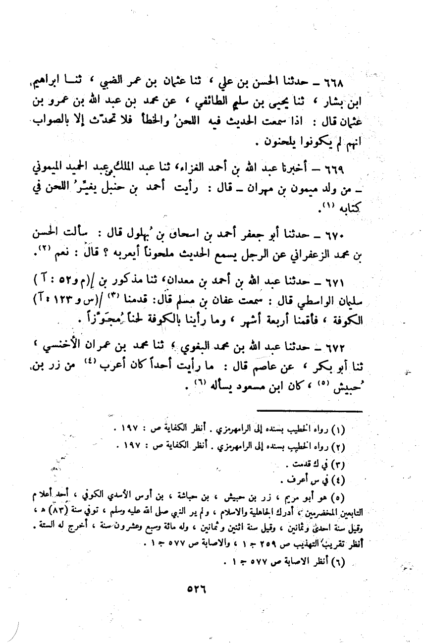 حَدَّثَنَا عَبْدُ اللَّهِ بْنُ مُحَمَّدٍ الْبَغَوِيُّ، حَدَّثَنَا مُحَمَّدُ بْنُ عِمْرَانَ الْأَخْنَسِيُّ، حَدَّثَنَا أَبُو بَكْرٍ، عَنْ عَاصِمٍ قَالَ: «§مَا رَأَيْتُ أَحَدًا كَانَ أَعْرَبَ مِنْ زِرِّ بْنِ حُبَيْشٍ، كَانَ ابْنُ مَسْعُودٍ يَسْأَلُهُ» -[527]- قَالَ الْقَاضِي: أَمَّا تَغْيِيرُ اللَّحْنِ فَوُجُوبِهِ ظَاهَرٌ، لِأَنَّ مِنَ اللَّحْنِ مَا يُزِيلُ الْمَعْنَى وَيُغَيِّرُهُ عَنْ طَرِيقِ حُكْمِهِ، وَكَثِيرٌ مِنْ رُوَاةِ الْحَدِيثِ لَا يَضْبِطُونَ الْإِعْرَابَ وَلَا يُحْسِنُونَهُ، وَرُبَّمَا حَرَّفُوا الْكَلَامَ عَنْ وَجْهِهِ، وَوَضَعُوا الْخِطَابَ فِي غَيْرِ مَوْضِعِهِ، وَلَيْسَ يَلْزَمُ مَنْ أَخَذَ عَنْ هَذِهِ الطَّائِفَةِ أَنْ يَحْكِيَ أَلْفَاظَهُمْ إِذَا عَرَفَ وَجْهَ الصَّوَابِ، إِذَا كَانَ الْمُرَادُ مِنَ الْحَدِيثِ مَعْلُومًا ظَاهِرًا، وَلَفْظُ الْعَرَبِ بِهِ مَعْرُوفًا فَاشِيًا، أَلَا تَرَى أَنَّ الْمُحَدِّثَ، إِذَا قَالَ: «لَا يَؤُمُّ الْمُسَافِرَ الْمُقِيمُ» فَنَصَبَ الْمُسَافِرَ وَرَفَعَ الْمُقِيمَ، وَكَذَلِكَ: «لَا يَؤُمُّ الْمُقَيَّدَ الْمُطْلَقُ» فَنَصَبَ الْمُقَيَّدَ وَرَفَعَ الْمُطْلَقَ كَانَ قَدْ أَحَالَ وَكُنَّا عِنْدَ عَبْدِ اللَّهِ بْنِ أَحْمَدَ بْنِ مُوسَى عَبْدَانَ يَوْمًا وَهُوَ يُحَدِّثُنَا، وَأَبُو الْعَبَّاسِ سُرَيْجٌ حَاضِرٌ، فَقَالَ عَبْدَانُ: مَنْ دُعِيَ فَلَمْ يَجِبْ فَقَدْ عَصَى اللَّهَ وَرَسُولَهُ فَفَتَحَ الْيَاءَ مِنْ قَوْلِهِ «يُجِبْ» ، فَقَالَ لَهُ ابْنُ سُرَيْجٍ: إِنْ رَأَيْتَ أَنْ تَقُولَ: يُجِبْ يَعْنِي بِضَمِّ الْيَاءِ فَأَبَى عَبْدَانُ أَنْ يَقُولَ، وَعَجِبَ مِنْ صَوَابِ ابْنِ سُرَيْجٍ، كَمَا عَجِبَ ابْنُ سُرَيْجٍ مِنْ خَطَئِهِ فَهَذَا وَنَحْوُهُ يُزِيلُ الْمَعْنَى، فَلَا يَعْتَدُّ بِأَلْفَاظِ هَذِهِ الطَّائِفَةِ، وَلَا يَلْتَفِتُ إِلَى كَرَاهِيَّتِهِمْ لِلْإِعْرَابِ وَذَمِّهِمْ لِأَهْلِهِ