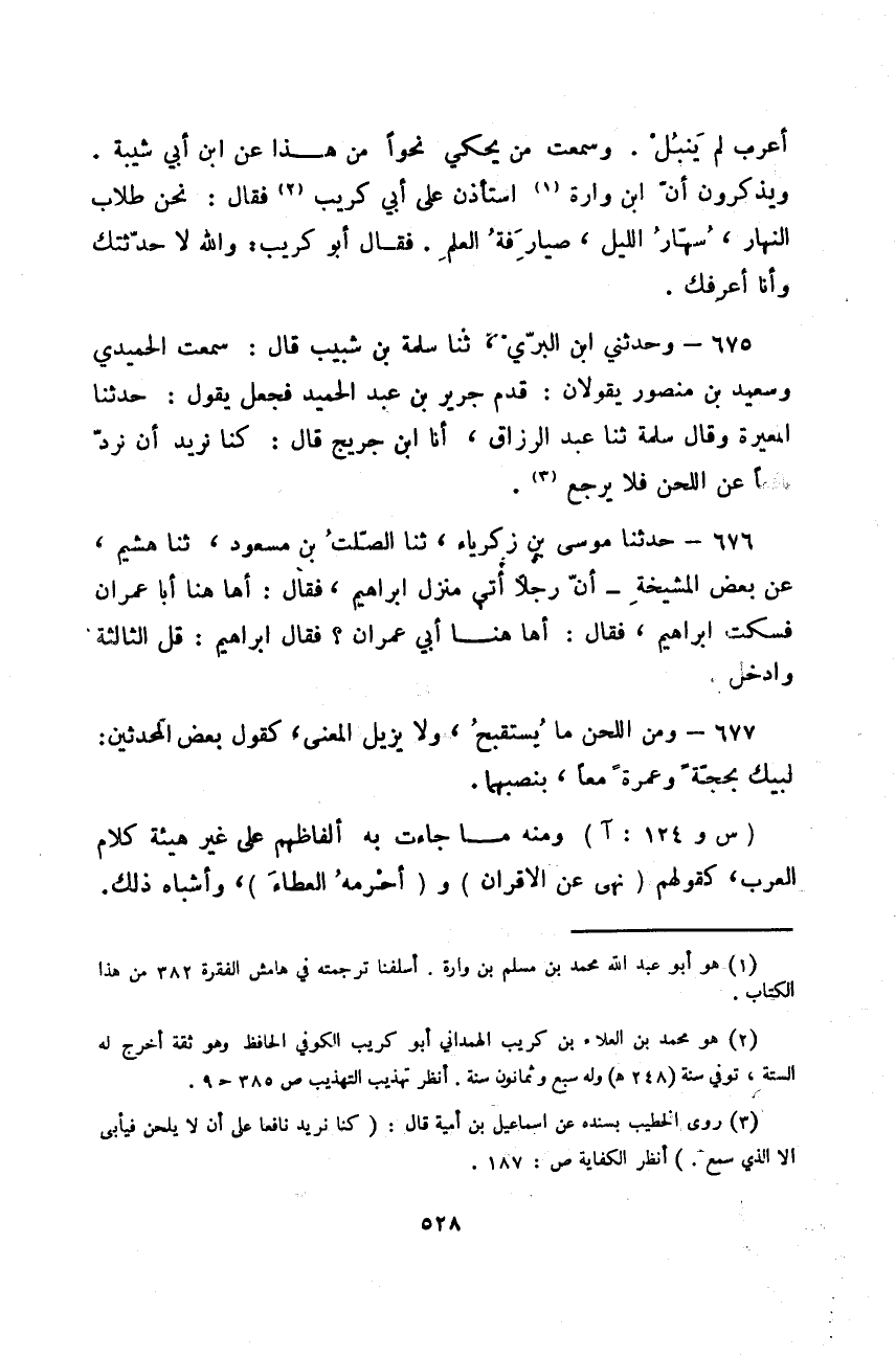 حَدَّثَنَا مُوسَى بْنُ زَكَرِيَّاءَ، ثَنَا الصَّلْتُ بْنُ مَسْعُودٍ، ثَنَا هُشَيْمٌ، عَنْ بَعْضِ الْمَشْيَخَةَ،: " أَنَّ رَجُلًا أَتَى مَنْزِلَ إِبْرَاهِيمَ، فَقَالَ: أَهَاهُنَا أَبَا عِمْرَانَ؟ فَسَكَتَ إِبْرَاهِيمُ، فَقَالَ: أَهَاهُنَا أَبِي عِمْرَانَ؟ فَقَالَ إِبْرَاهِيمُ: §قُلِ الثَّالِثَةَ وَادْخُلْ " وَمِنَ اللَّحْنِ مَا يُسْتَقْبَحُ، وَلَا يُزِيلُ الْمَعْنَى، كَقَوْلِ بَعْضِ الْمُحَدِّثِينَ: لَبَّيْكَ بِحَجَّةً وَعُمْرَةً مَعًا بِنَصْبِهِمَا وَمِنْهُ مَا جَاءَتْ بِهِ أَلْفَاظُهُمْ عَلَى غَيْرِ هَيْئَةِ كَلَامِ الْعَرَبِ، كَقَوْلِهِمْ: نَهَى عَنِ الْإِقْرَانِ وَأَحْرَمَهُ الْعَطَاءَ وَأَشْبَاهُ ذَلِكَ -[529]- وَمِنْهُ مَا جَاءَ عَلَى وَجْهِ الْحِكَايَةِ، مِثْلُ قَوْلِهِمْ: سُئِلَ النَّبِيُّ صَلَّى اللهُ عَلَيْهِ وَسَلَّمَ، عَنِ {السَّائِحُونَ} [التوبة: 112] ، فَقَالَ: «الصَّائِمُونَ» كَأَنَّ تَقْدِيرُهُ سُئِلَ عَنْ قَوْلِ اللَّهِ عَزَّ وَجَلَّ: {التَّائِبُونَ الْعَابِدُونَ الْحَامِدُونَ السَّائِحُونَ} [التوبة: 112] ، يَحْكِي اللَّفْظَ فِي التَّنْزِيلِ