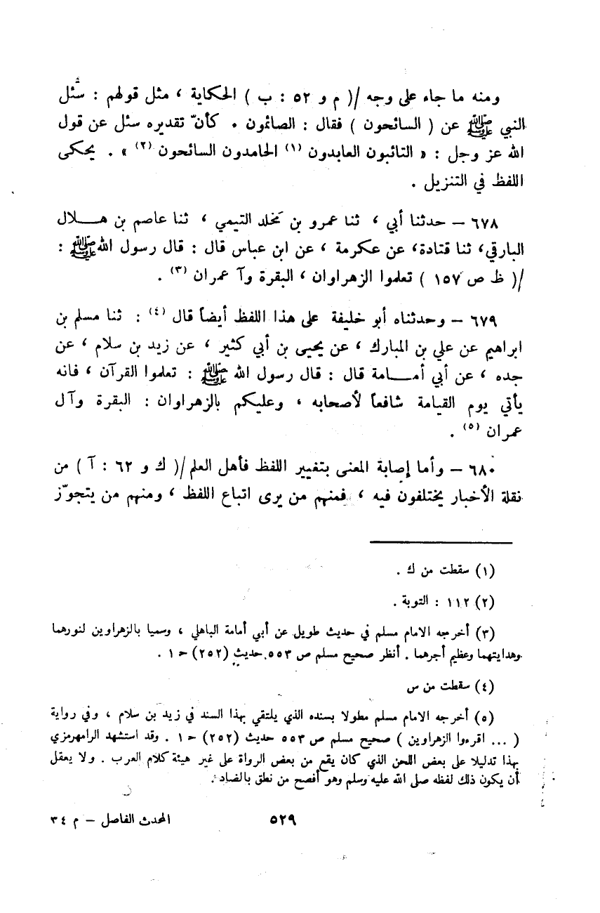 وَحَدَّثَنَاهُ أَبُو خَلِيفَةَ، عَلَى هَذَا اللَّفْظِ أَيْضًا قَالَ: ثَنَا مُسْلِمُ بْنُ إِبْرَاهِيمَ، عَنْ عَلِيِّ بْنِ الْمُبَارَكِ، عَنْ يَحْيَى بْنِ أَبِي كَثِيرٍ، عَنْ زَيْدِ بْنِ سَلَّامٍ، عَنْ جَدِّهِ، عَنْ أَبِي أُمَامَةَ قَالَ: قَالَ رَسُولُ اللَّهِ صَلَّى اللهُ عَلَيْهِ وَسَلَّمَ: " §تَعَلَّمُوا الْقُرْآنَ، فَإِنَّهُ يَأْتِي يَوْمَ الْقِيَامَةِ شَافِعًا لِأَصْحَابِهِ، وَعَلَيْكُمْ بِالزَّهْرَاوَانِ: الْبَقَرَةِ وَآلِ عِمْرَانَ " وَأَمَّا إِصَابَةُ الْمَعْنَى بِتَغْيِيرِ اللَّفْظِ فَأَهْلُ الْعِلْمِ مِنْ نَقَلَةِ الْأَخْبَارِ يَخْتَلِفُونَ فِيهِ، فَمِنْهُمْ مَنْ يَرَى اتِّبَاعَ اللَّفْظِ، وَمِنْهُمْ مَنْ يَتَجَوَّزْ -[530]- فِي ذَلِكَ إِذَا أَصَابَ الْمَعْنَى، وَكَذَلِكَ سَبِيلُ التَّقْدِيمِ وَالتَّأْخِيرِ، وَالزِّيَادَةُ وَالنُّقْصَانُ، فَإِنَّ مِنْهُمْ مَنْ يَعْتَمِدُ الْمَعْنَى، وَلَا يَعْتَدُّ بِاللَّفْظِ، وَمِنْهُمْ مَنْ يُشَدِّدُ فِي ذَلِكَ وَلَا يُفَارِقُ اللَّفْظَ وَقَدْ دَلَّ قَوْلُ الشَّافِعِيِّ فِي صِفَةِ الْمُحَدِّثِ مَعَ رِعَايَةِ اتِّبَاعِ اللَّفْظِ عَلَى أَنَّهُ يَسُوغُ لِلْمُحَدِّثِ أَنْ يَأْتِيَ بِالْمَعْنَى دُونَ اللَّفْظِ، إِذَا كَانَ عَالِمًا بِلُغَاتِ الْعَرَبِ وَوُجُوهِ خِطَابِهَا، بَصِيرًا بِالْمَعَانِي وَالْفِقْهِ، عَالِمًا بِمَا يُحِيلُ الْمَعْنَى وَمَا لَا يُحِيلُهُ، فَإِنَّهُ إِذَا كَانَ بِهَذِهِ الصِّفَةِ جَازَ لَهُ نَقْلُ اللَّفْظِ، فَإِنَّهُ يَحْتَرِزُ بِالْفَهْمِ عَنْ تَغْييرِ الْمَعَانِي وَإِزَالَةِ أَحْكَامِهَا، وَمَنْ لَمْ يَكُنْ بِهَذِهِ الصِّفَةِ كَانَ أَدَاءُ اللَّفْظِ لَهُ لَازِمًا، وَالْعُدُولُ عَنْ هَيْئَةِ مَا يَسْمَعُهُ عَلَيْهِ مَحْظُورًا، وَإِلَى هَذَا رَأَيْتُ الْفُقَهَاءَ مِنْ أَهْلِ الْعِلْمِ يَذْهَبُونَ وَمِنَ الْحُجَّةِ لِمَنْ ذَهَبَ إِلَى هَذَا الْمَذْهَبِ أَنَّ اللَّهَ تَعَالَى قَدْ قَصَّ مِنْ أَنْبَاءِ مَا قَدْ سَبَقَ قَصَصًا، كَرَّرَ ذِكْرَ بَعْضِهَا فِي مَوَاضِعَ بِأَلْفَاظٍ مُخْتَلِفَةٍ، وَالْمَعْنَى وَاحِدٌ، وَنَقَلَهَا مِنْ أَلْسِنَتِهِمْ إِلَى اللِّسَانِ الْعَرَبِيِّ، وَهُوَ مُخَالِفٌ لَهَا فِي التَّقْدِيمِ وَالتَّأْخِيرِ، وَالْحَذْفِ وَالْإِلْغَاءِ، وَالزِّيَادَةِ وَالنُّقْصَانِ وَغَيْرِ ذَلِكَ، وَقَدْ حُكِيَتْ هَذِهِ الْحُجَّةَ بِعَيْنِهَا عَنِ الْحَسَنِ
