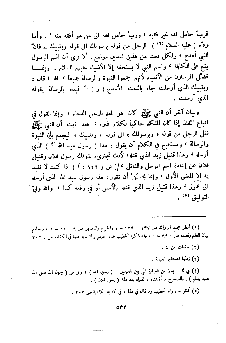 : «فَرُبَّ حَامِلِ فِقْهٍ غَيْرِ فَقِيهٍ، وَرُبَّ حَامِلِ فِقْهٍ إِلَى مَنْ هُوَ أَفْقَهُ مِنْهُ» وَأَمَّا رَدُّهُ عَلَيْهِ السَّلَامُ الرَّجُلَ مِنْ قَوْلِهِ: «بِرَسُولِكَ» إِلَى قَوْلِهِ: «وَبِنَبِيِّكَ» فَإِنَّ النَّبِيَّ أَمْدَحُ، وَلِكُلِّ نَعْتٍ مِنْ هَذَيْنِ النَّعْتَيْنِ مَوْضِعٌ، أَلَا تَرَى أَنَّ اسْمَ الرَّسُولَ يَقَعُ عَلَى الْكَافَّةِ، وَاسْمُ النَّبِيِّ لَا يَسْتَحِقُّهُ إِلَّا الْأَنْبِيَاءُ عَلَيْهِمُ السَّلَامُ وَإِنَّمَا فُضِّلَ الْمُرْسَلُونَ مِنَ الْأَنْبِيَاءِ لِأَنَّهُمْ جَمَعُوا النُّبُوَّةَ وَالرِّسَالَةَ جَمِيعًا، فَلَمَّا قَالَ: «وَبِنَبِيِّكَ الَّذِي أَرْسَلْتَ» جَاءَ بِالنَّعْتِ الْأَمْدَحِ وَقَيَّدَهُ بِالرِّسَالَةِ بِقَوْلِهِ: «الَّذِي أَرْسَلْتَ» وَبَيَانٌ آخَرُ أَنَّ النَّبِيَّ صَلَّى اللهُ عَلَيْهِ وَسَلَّمَ كَانَ هُوَ الْمُعَلِّمُ لِلرَّجُلِ الدُّعَاءَ، وَإِنَّمَا الْقَوْلُ فِي اتِّبَاعِ اللَّفْظِ، إِذَا كَانَ الْمُتَكَلِّمُ حَاكِيًا لِكَلَامِ غَيْرِهِ، فَقَدْ ثَبَتَ أَنَّ النَّبِيَّ صَلَّى اللهُ عَلَيْهِ وَسَلَّمَ نَقَلَ الرَّجُلَ مِنْ قَوْلِهِ: «وَبِرَسُولِكَ» ، إِلَى قَوْلِهِ: «وَبِنَبِيِّكَ» ، لَيَجْمَعَ بَيْنَ النُّبُوَّةِ وَالرِّسَالَةِ، وَمُسْتَقْبَحٌ فِي الْكَلَامِ أَنْ يَقُولَ: هَذَا رَسُولُ عَبْدِ اللَّهِ الَّذِي أَرْسَلَهُ، وَهَذَا قَتِيلُ زَيْدٍ الَّذِي قَتَلَهُ، لِأَنَّكَ تَجْتَزِئُ بِقَوْلِكَ رَسُولَ فُلَانٍ وَقَتِيلَ فُلَانٍ، عَنْ إِعَادَةِ اسْمِ الْمُرْسَلِ وَالْقَاتِلِ، إِذَا كُنْتَ لَا تُفِيدُ بِهِ إِلَّا الْمَعْنَى الْأَوَّلَ، وَإِنَّمَا يُحْسُنُ أَنْ تَقُولَ: هَذَا رَسُولُ عَبْدِ اللَّهِ الَّذِي أَرْسَلَهُ إِلَى عَمْرٍو، وَهَذَا قَتِيلُ زَيْدٍ الَّذِي قَتَلَهُ بِالْأَمْسِ أَوْ فِي وَقْعَةِ كَذَا، وَاللَّهُ وَلِيُّ التَّوْفِيقِ