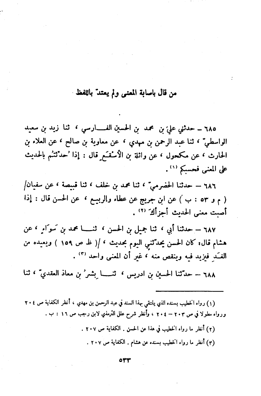 حَدَّثَنِي عَلِيُّ بْنُ مُحَمَّدِ بْنِ الْحُسَيْنِ الْفَارِسِيُّ، ثنا زَيْدُ بْنُ سَعِيدٍ الْوَاسِطِيُّ، ثنا عَبْدُ الرَّحْمَنِ بْنُ مَهْدِيٍّ، عَنْ مُعَاوِيَةَ بْنِ صَالِحٍ، عَنِ الْعَلَاءِ بْنِ الْحَارِثِ، عَنْ مَكْحُولٍ، عَنْ وَاثِلَةَ بْنِ الْأَسْقَعِ، قَالَ: «§إِذَا حَدَّثْتُمْ بِالْحَدِيثِ عَلَى الْمَعْنَى فَحَسْبُكُمْ»