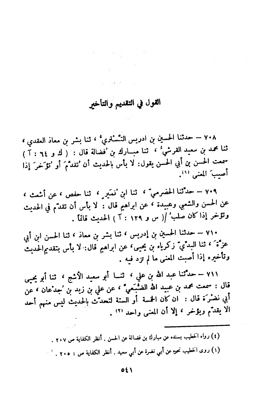 حَدَّثَنَا الْحَضْرَمِيُّ، ثنا ابْنُ نُمَيْرٍ، ثنا حَفْصٌ، عَنْ أَشْعَثَ، عَنِ الْحَسَنِ، وَالشَّعْبِيِّ، وَعُبَيْدَةَ، عَنْ إِبْرَاهِيمَ قَالَ: «§لَا بَأْسَ أَنْ تُقَدِّمَ فِي الْحَدِيثِ وَتُؤَخِّرَ، إِذَا كَانَ صُلْبُ الْحَدِيثِ قَائِمًا»