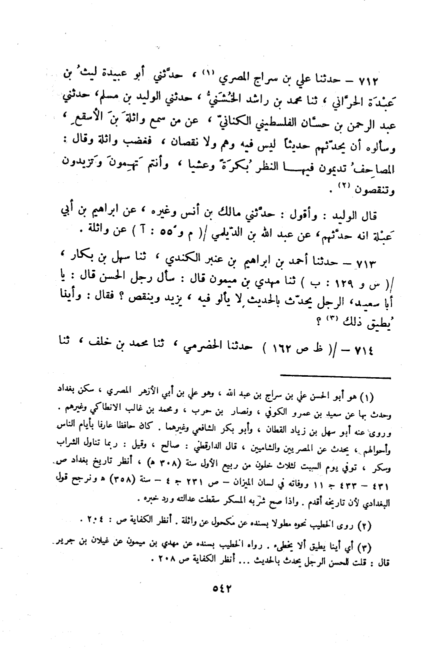 حَدَّثَنَا عَلِيُّ بْنُ سِرَاجٍ الْمِصْرِيُّ، حَدَّثَنِي أَبُو عُبَيْدَةَ لَيْثُ بْنُ عَبْدَةَ الْحَرَّانِيُّ، ثنا مُحَمَّدُ بْنُ رَاشِدٍ الْخُشَنِيُّ، حَدَّثَنِي الْوَلِيدُ بْنُ مُسْلِمٍ، حَدَّثَنِي عَبْدُ الرَّحْمَنِ بْنُ حَسَّانَ الْفِلَسْطِينِيُّ الْكِنَانِيُّ، عَنْ مَنْ، سَمِعَ وَاثِلَةَ بْنَ الْأَسْقَعِ، وَسَأَلُوهُ أَنْ يُحَدِّثَهُمُ حَدِيثًا لَيْسَ فِيهِ وَهْمٌ وَلَا نُقْصَانُ، فَغَضِبَ وَاثِلَةُ وَقَالَ: «§الْمَصَاحِفُ تُدِيمُونَ فِيهَا النَّظَرَ بُكْرَةً وَعَشِيًّا، وَأَنْتُمْ تَهِمُونَ وَتَزِيدُونَ وَتُنْقِصُونَ» قَالَ الْوَلِيدُ: وَأَقُولُ حَدَّثَنِي مَالِكُ بْنُ أَنَسٍ وَغَيْرُهُ، عَنْ إِبْرَاهِيمَ بْنِ أَبِي عَبْلَةَ أَنْهَ حَدَّثَهُمْ، عَنْ عَبْدِ اللَّهِ بْنِ الدَّيْلَمِيِّ عَنْ وَاثِلَةَ