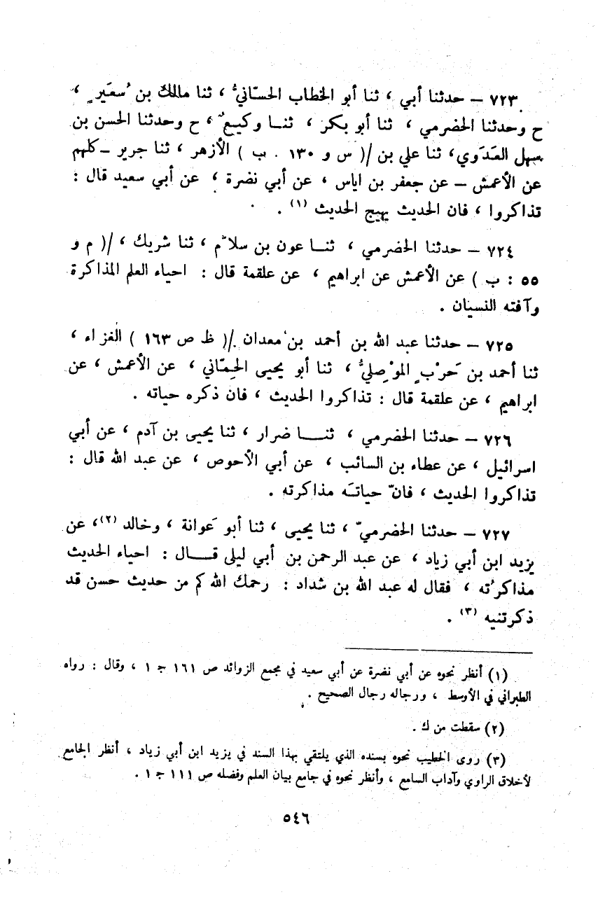 حَدَّثَنَا أَبِي، ثنا أَبُو الْخَطَّابِ الْحَسَّانَيُّ، ثنا مَالِكُ بْنُ سُعَيْرٍ، ح وَحَدَّثَنَا الْحَضْرَمِيُّ، ثنا أَبُو بَكْرٍ، ثنا وَكِيعٌ، ح وَحَدَّثَنَا الْحَسَنُ بْنُ سَهْلٍ الْعَدَوِيُّ، ثنا عَلِيُّ بْنُ الْأَزْهَرِ، ثنا جَرِيرٌ، كُلُّهُمْ عَنِ الْأَعْمَشِ، عَنْ جَعْفَرِ بْنِ إِيَاسَ، عَنْ أَبِي نَضْرَةَ، عَنْ أَبِي سَعِيدٍ قَالَ: «§تَذَاكَرُوا، فَإِنَّ الْحَدِيثَ يُهَيِّجُ الْحَدِيثَ»
