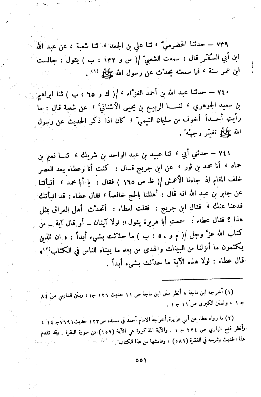 حَدَّثَنِي أَبِي، ثنا عُبَيْدُ بْنُ عَبْدِ الْوَاحِدِ بْنِ شَرِيكٍ، ثنا نُعَيْمُ بْنُ حَمَّادٍ، أنا مُحَمَّدُ بْنُ ثَوْرٍ، عَنِ ابْنِ جُرَيْجٍ قَالَ: كُنْتُ أَنَا وَعَطَاءٌ بَعْدَ الْعَصْرِ خَلْفَ الْمَقَامِ، إِذْ جَاءَنَا الْأَعْمَشُ فَقَالَ: يَا أَبَا مُحَمَّدٍ، أَنْبَأْتَنَا عَنْ جَابِرِ بْنِ عَبْدِ اللَّهِ أَنَّهُ قَالَ: أَهْلَلْنَا بِالْحَجِّ خَالِصًا فَقَالَ عَطَاءٌ: قَدْ أَنْبَأْتُكَ فَدَعْنَا عَنْكَ فَقَالَ ابْنُ جُرَيْجٍ: فَقُلْتُ لِعَطَاءٍ: أَتُحَدِّثُ أَهْلَ الْعِرَاقِ بِمِثْلِ هَذَا؟ فَقَالَ عَطَاءٌ: سَمِعْتُ أَبَا هُرَيْرَةَ يَقُولُ: " §لَوْلَا آيَتَانِ أَوْ قَالَ آيَةٌ مِنْ كِتَابِ اللَّهِ عَزَّ وَجَلَّ مَا حَدَّثْتُ بِشَيْءٍ أَبَدًا: {إِنَّ الَّذِينَ يَكْتُمُونَ مَا أَنْزَلْنَا مِنَ الْبَيِّنَاتِ وَالْهُدَى مِنْ بَعْدِ مَا بَيَّنَّاهُ لِلنَّاسِ فِي الْكِتَابِ} [البقرة: 159] " قَالَ عَطَاءٌ: «لَوْلَا هَذِهِ الْآيَةُ مَا حَدَّثْتُ بِشَيْءٍ أَبَدًا»
