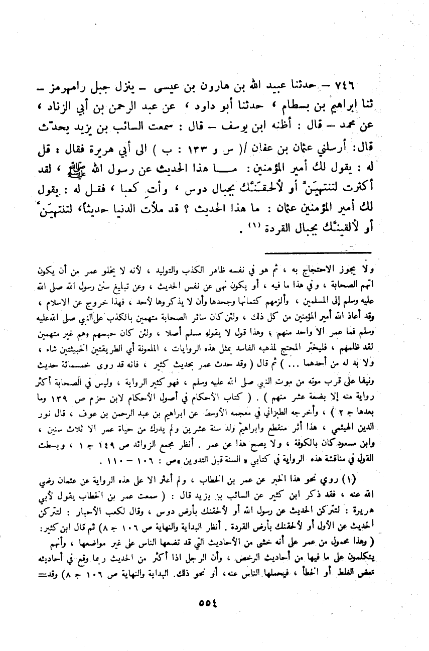 حَدَّثَنَا عُبَيْدُ اللَّهِ بْنُ هَارُونَ بْنِ عِيسَى، يَنْزِلُ جَبَلَ رَامَهُرْمُزَ ثنا إِبْرَاهِيمُ بْنُ بِسْطَامٍ، حَدَّثَنَا أَبُو دَاوُدَ، عَنْ عَبْدِ الرَّحْمَنِ بْنِ أَبِي الزِّنَادِ، عَنْ مُحَمَّدٍ قَالَ: أَظُنُّهُ ابْنَ يُوسُفَ قَالَ: سَمِعْتُ السَّائِبَ بْنَ يَزِيدَ يُحَدِّثُ قَالَ: أَرْسَلَنِي عُثْمَانُ بْنُ عَفَّانَ إِلَى أَبِي هُرَيْرَةَ فَقَالَ: قُلْ لَهُ: " يَقُولُ لَكَ أَمِيرُ الْمُؤْمِنِينَ: مَا هَذَا الْحَدِيثُ عَنْ رَسُولِ اللَّهِ صَلَّى اللهُ عَلَيْهِ وَسَلَّمَ، لَقَدْ أَكْثَرْتَ §لَتَنْتَهِيَنَّ أَوْ لَأَلْحَقَنَّكَ بِجِبَالِ دَوْسٍ، وَأْتِ كَعْبًا، فَقُلْ لَهُ: يَقُولُ لَكَ أَمِيرُ الْمُؤْمِنِينَ عُثْمَانُ: مَا هَذَا الْحَدِيثُ؟ قَدْ مَلَأْتَ الدُّنْيَا حَدِيثًا، لَتَنْتَهِيَنَّ أَوْ لَأَلْقِيَنَّكَ بِجِبَالِ الْقِرَدَةِ "