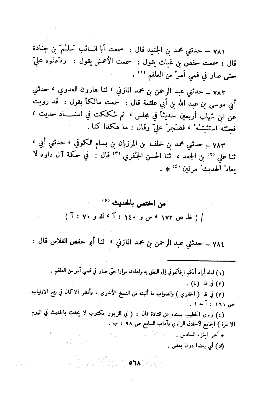 حَدَّثَنِي مُحَمَّدُ بْنُ الْجُنَيْدِ، قَالَ: سَمِعْتُ أَبَا السَّائِبِ سَلْمَ بْنَ جُنَادَةَ قَالَ: سَمِعْتُ حَفْصَ بْنَ غِيَاثٍ يَقُولُ: سَمِعْتُ الْأَعْمَشُ يَقُولُ: «§رَدَدْتُمُوهُ عَلَيَّ حَتَّى صَارَ فِي فَمِي أَمَرَّ مِنَ الْعَلْقَمِ»