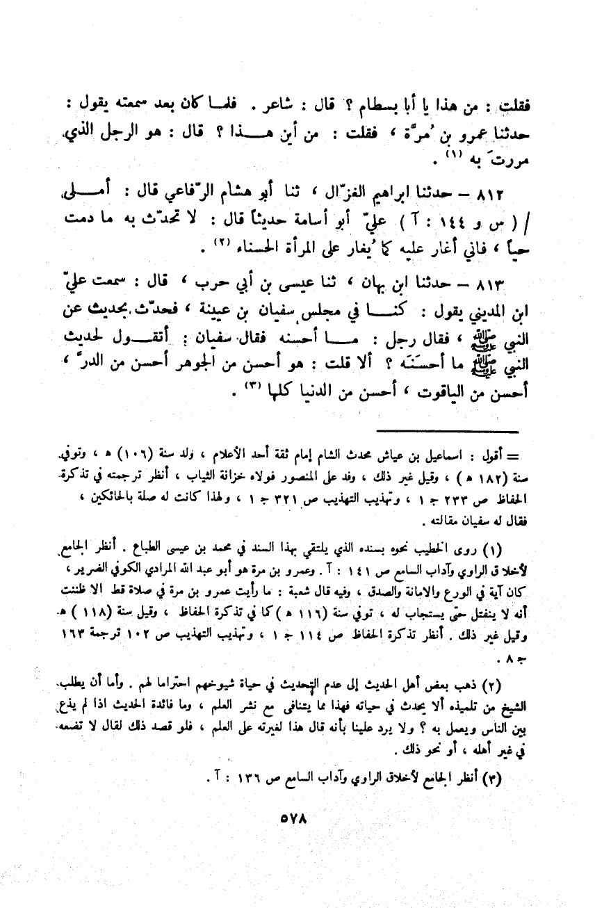 حَدَّثَنَا ابْنُ بَهَانَ، ثنا عِيسَى بْنُ أَبِي حَرْبٍ، قَالَ: سَمِعْتُ عَلِيَّ بْنَ الْمَدِينِيِّ، يَقُولُ: كُنَّا فِي مَجْلِسِ سُفْيَانَ بْنِ عُيَيْنَةَ، فَحَدَّثَ بِحَدِيثٍ عَنِ النَّبِيِّ صَلَّى اللهُ عَلَيْهِ وَسَلَّمَ، فَقَالَ رَجُلٌ: مَا أَحْسَنَهُ، فَقَالَ سُفْيَانُ: " §أَتَقُولُ لِحَدِيثِ النَّبِيِّ صَلَّى اللهُ عَلَيْهِ وَسَلَّمَ مَا أَحْسَنَهُ؟ أَلَا قُلْتَ: هُوَ أَحْسَنُ مِنَ الْجَوْهَرِ أَحْسَنُ مِنَ الدُّرِّ، أَحْسَنُ مِنَ الْيَاقُوتِ، أَحْسَنُ مِنَ الدُّنْيَا كُلِّهَا "