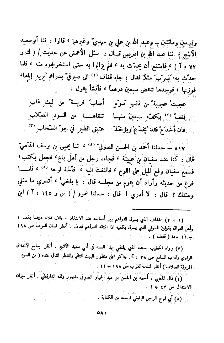 حَدَّثَنَا أَحْمَدُ بْنُ الْحَسَنِ الصُّوفِيُّ، ثنا يَحْيَى بْنُ يُوسُفَ الذِّمِّيُّ، قَالَ: كُنَّا عِنْدَ سُفْيَانَ بْنِ عُيَيْنَةَ، فَجَاءَهُ رَجُلٌ مِنْ أَهْلِ بَلْخٍ، فَجَعَلَ يَكْتُبُ فَسَمِعَ سُفْيَانَ وَقْعَ الْمَيْلِ عَلَى اللَّوْحِ، فَالْتَفَتَ إِلَيْهِ، فَأَخَذَ لَوْحَهُ، فَلَمَّا فَرَغَ مِنْ حَدِيثِهِ، وَأَرَادَ أَنْ يَقُومَ مِنْ مَجْلِسِهِ قَالَ: يَا بَلْخِيُّ، أَتَدْرِي مَا مَثَلِي وَمَثَلُكَ؟ قَالَ: لَا أَدْرِي قَالَ: حَدَّثَنَا عَمْرُو بْنُ -[581]- دِينَارٍ، سَمِعَ أَبَا فَاخِتَةَ سَعِيدَ بْنَ عِلَاقَةَ، حَدَّثَنِي جَارٌ لِي قَالَ: أَتَيْتُ عَلِيًّا بِأَسِيرٍ يَوْمَ صِفِّينَ، فَقَالَ: لَا تَقْتُلْنِي صَبْرًا، إِنِّي أَخَافُ اللَّهَ رَبِّ الْعَالَمِينَ فَقَالَ لِلَّذِي جَاءَ بِهِ: " خُذْ سِلَاحَهُ - قَالَ سُفْيَانُ: لَمْ يَنْفِلْهُ إِيَّاهُ، إِنَّهُ §لَا يَحِلُّ نَفْلُ مَالِ امْرِئٍ مُسْلِمٍ - وَلَكِنْ خُذْ سِلَاحَهُ لَا يُقَاتِلْنَا بِهِ مَرَّةً أُخْرَى، حَتَّى تَنْقَطِعَ الْحَرْبُ فِيمَا بَيْنَنَا وَبَيْنَهُمْ " وَقَدْ أَخَذْتُ سِلَاحَكَ - يَعْنِي أَلْوَاحَكَ - وَقَدْ رَدَدْتُهُ عَلَيْكَ