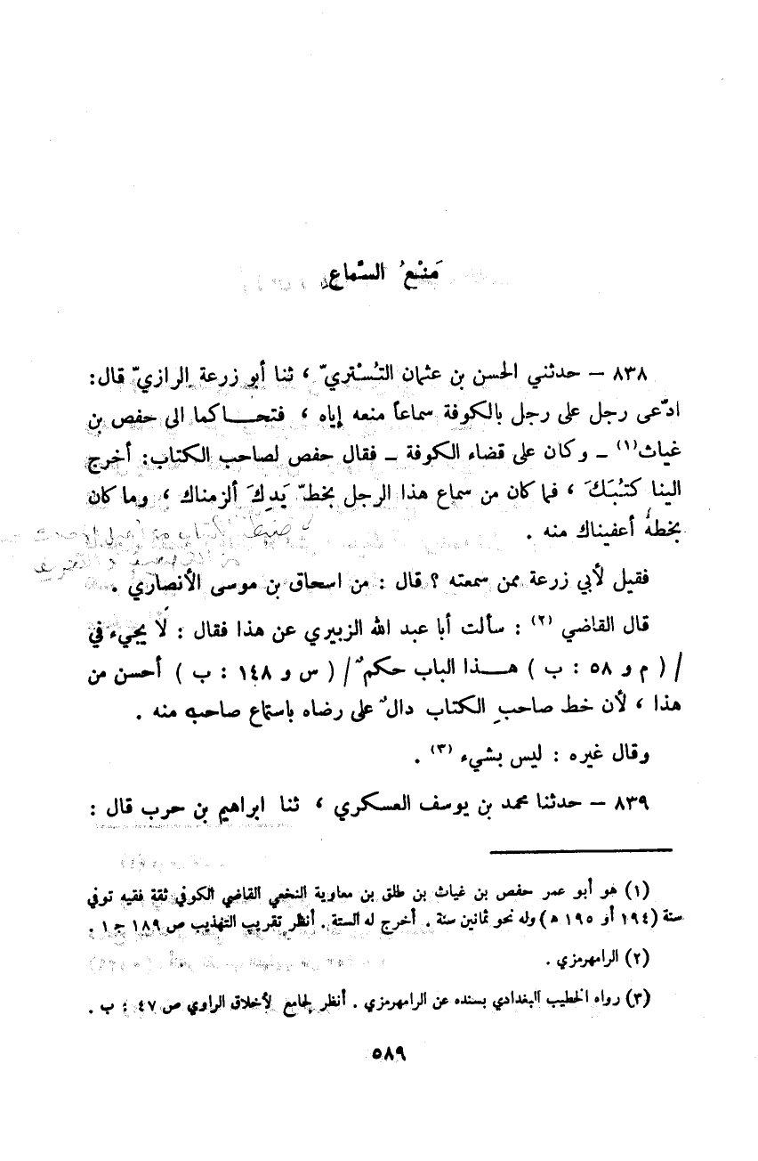 حَدَّثَنِي الْحَسَنُ بْنُ عُثْمَانَ التُّسْتَرِيُّ، ثنا أَبُو زُرْعَةَ الرَّازِيُّ، قَالَ: " §ادَّعَى رَجُلٌ عَلَى رَجُلٍ بِالْكُوفَةِ سَمَاعًا مَنَعَهُ إِيَّاهُ، فَتْحَاكَمَا إِلَى حَفْصِ بْنِ غِيَاثٍ وَكَانَ عَلَى قَضَاءِ الْكُوفَةِ، فَقَالَ حَفْصٌ لِصَاحِبِ الْكِتَابِ: أَخْرِجْ إِلَيْنَا كُتُبَكَ، فَمَا كَانَ مِنْ سَمَاعِ هَذَا الرَّجُلِ بِخَطِّ يَدِكَ أَلْزَمْنَاكَ، وَمَا كَانَ بِخَطِّهِ أَعْفَيْنَاكَ مِنْهُ فَقِيلَ لِأَبِي زُرْعَةَ مِمَّنْ سَمِعْتَهُ؟ قَالَ: مِنْ إِسْحَاقَ بْنِ مُوسَى الْأَنْصَارِيِّ " قَالَ الْقَاضِي: سَأَلْتُ أَبَا عَبْدِ اللَّهِ الزُّبَيْرِيَّ عَنْ هَذَا، فَقَالَ: لَا يَجِيءُ فِي هَذَا الْبَابِ حُكْمٌ أَحْسَنُ مِنْ هَذَا، لِأَنَّ خَطَّ صَاحِبِ الْكِتَابِ دَالٌ عَلَى رِضَاهُ بِاسْتِمَاعِ صَاحِبِهِ مِنْهُ، وَقَالَ غَيْرُهُ: لَيْسَ بِشَيْءٍ