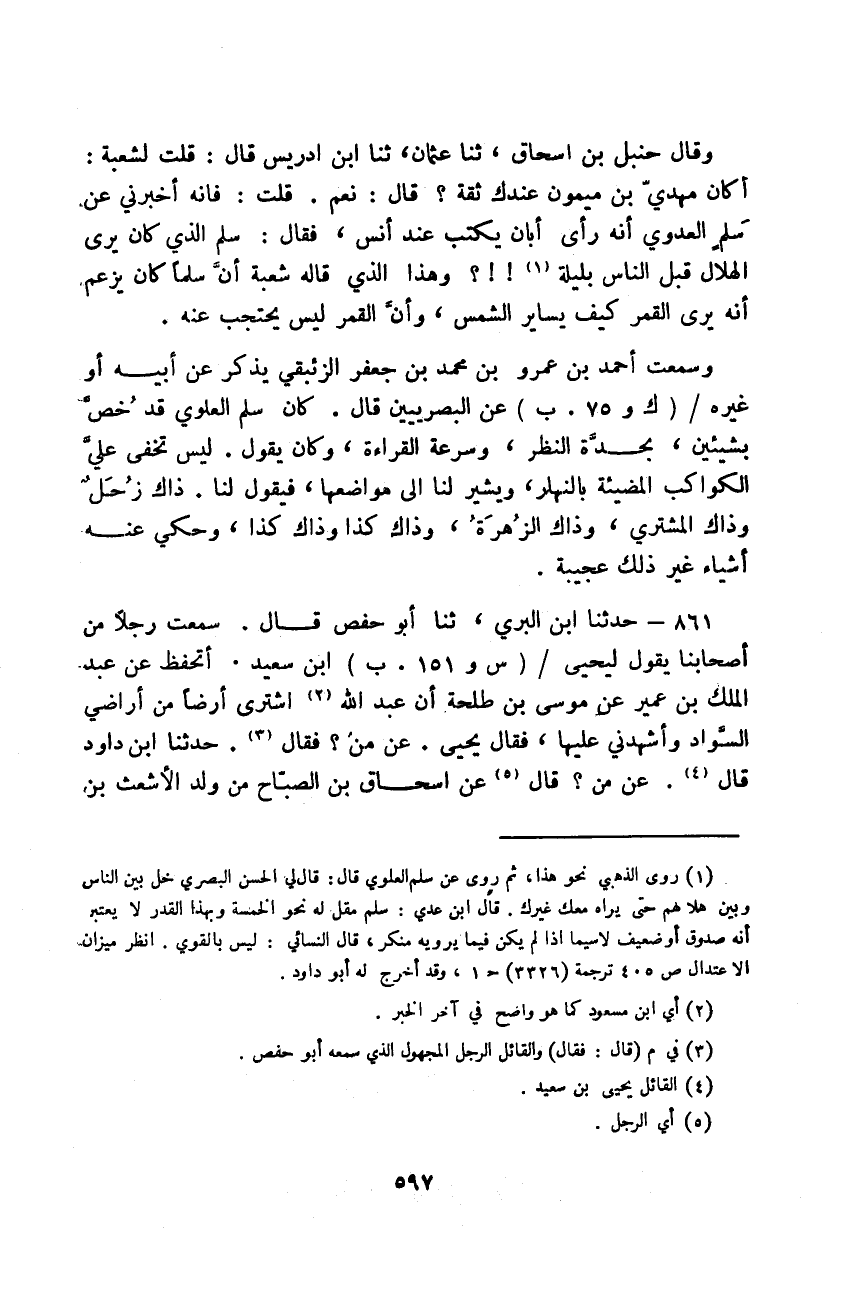 وَقَالَ حَنْبَلُ بْنُ إِسْحَاقَ، ثنا عُثْمَانُ، ثنا ابْنُ إِدْرِيسَ قَالَ: قُلْتُ لِشُعْبَةَ: §أَكَانَ مَهْدِيُّ بْنُ مَيْمُونٍ عِنْدَكَ ثِقَةٌ؟ قَالَ: نَعَمْ، قُلْتُ: فَإِنَّهُ أَخْبَرَنِي عَنْ سَلْمٍ الْعَدَوِيِّ أَنَّهُ رَأَى أَبَانَ يَكْتُبُ عِنْدَ أَنَسٍ، فَقَالَ: «سَلْمٌ الَّذِي كَانَ يَرَى الْهِلَالَ قَبْلَ النَّاسِ بِلَيْلَةٍ» وَهَذَا الَّذِي قَالَهُ شُعْبَةُ أَنَّ سِلِمًا كَانَ يَزْعُمُ أَنَّهُ يَرَى الْقَمَرَ كَيْفَ يُسَايِرُ الشَّمْسَ، وَأَنَّ الْقَمَرَ لَيْسَ يَحْتَجِبُ عَنْهُ