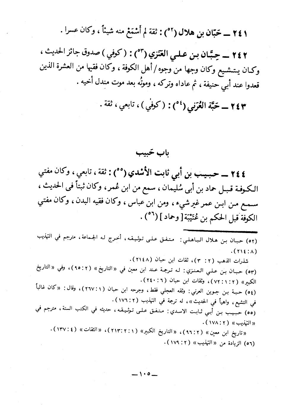 244- حبيب بن أبي ثابت الأسدي4: ثقة، تابعي، وكان مفتي الكوفة قبل حماد بن أبي سليمان، سمع من ابن عمر، وكان ثبتًا في الحديث، سمع من ابن عمر غير شيء، ومن ابن عباس، وكان فقيه البدن، وكان مفتي الكوفة قبل الحكم بن عُتَيبة "وحماد"5.