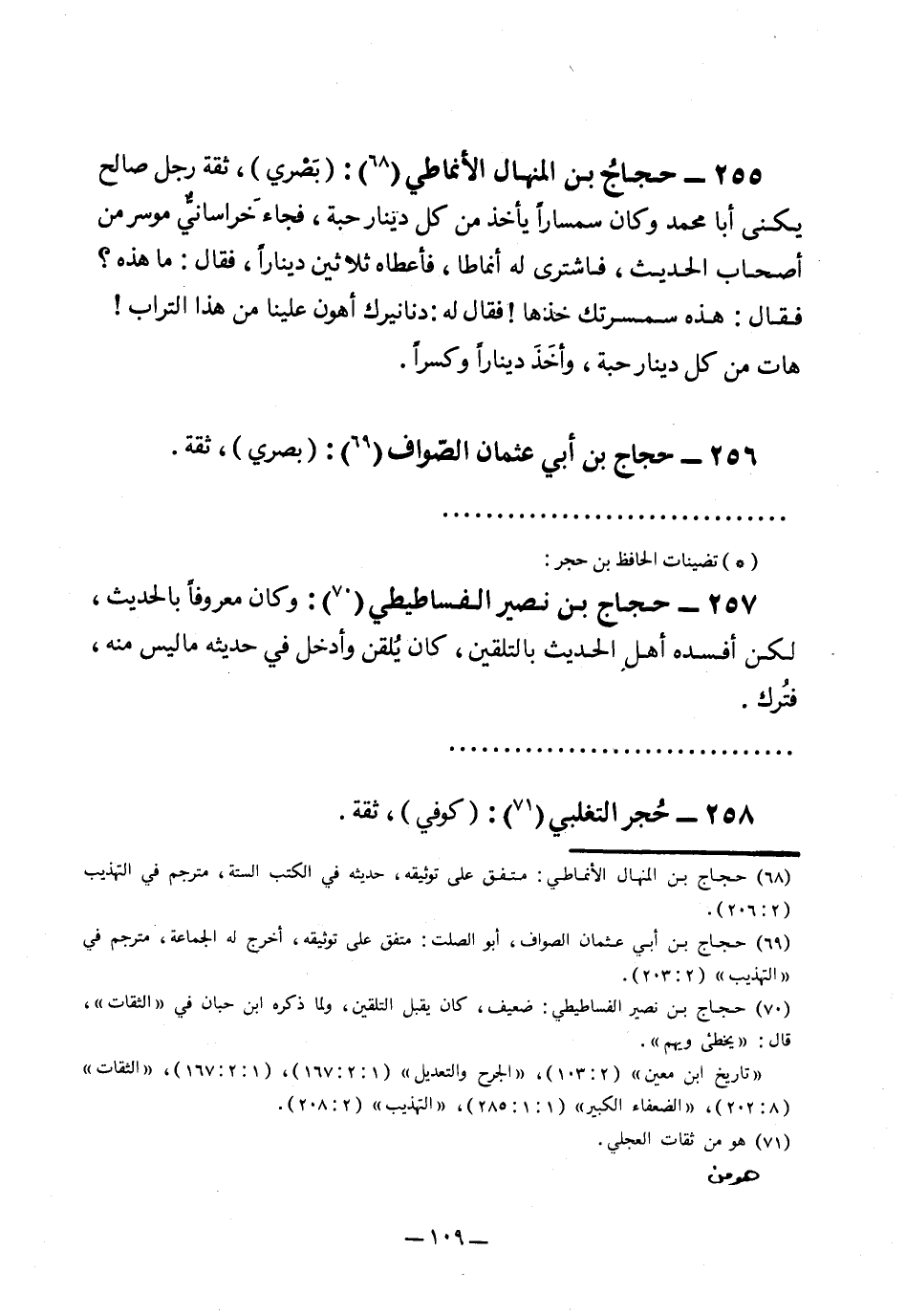 255- حجاج بن المنهال الأنماطي1: "بصري"، ثقة رجل صالح يكنى أبا محمد وكان سمسارًا يأخذ من كل دينار حبة، فجاء خراسانيٌّ موسر من أصحاب الحديث، فاشترى له أنماطًا، فأعطاه ثلاثين دينارًا، فقال: ما هذه؟ فقال: هذا سمسرتك خذها! فقال له: دنانيرك أهون علينا من هذا التراب! هات من كل دينار حبة، وأخذ دينارًا وكسرًا.