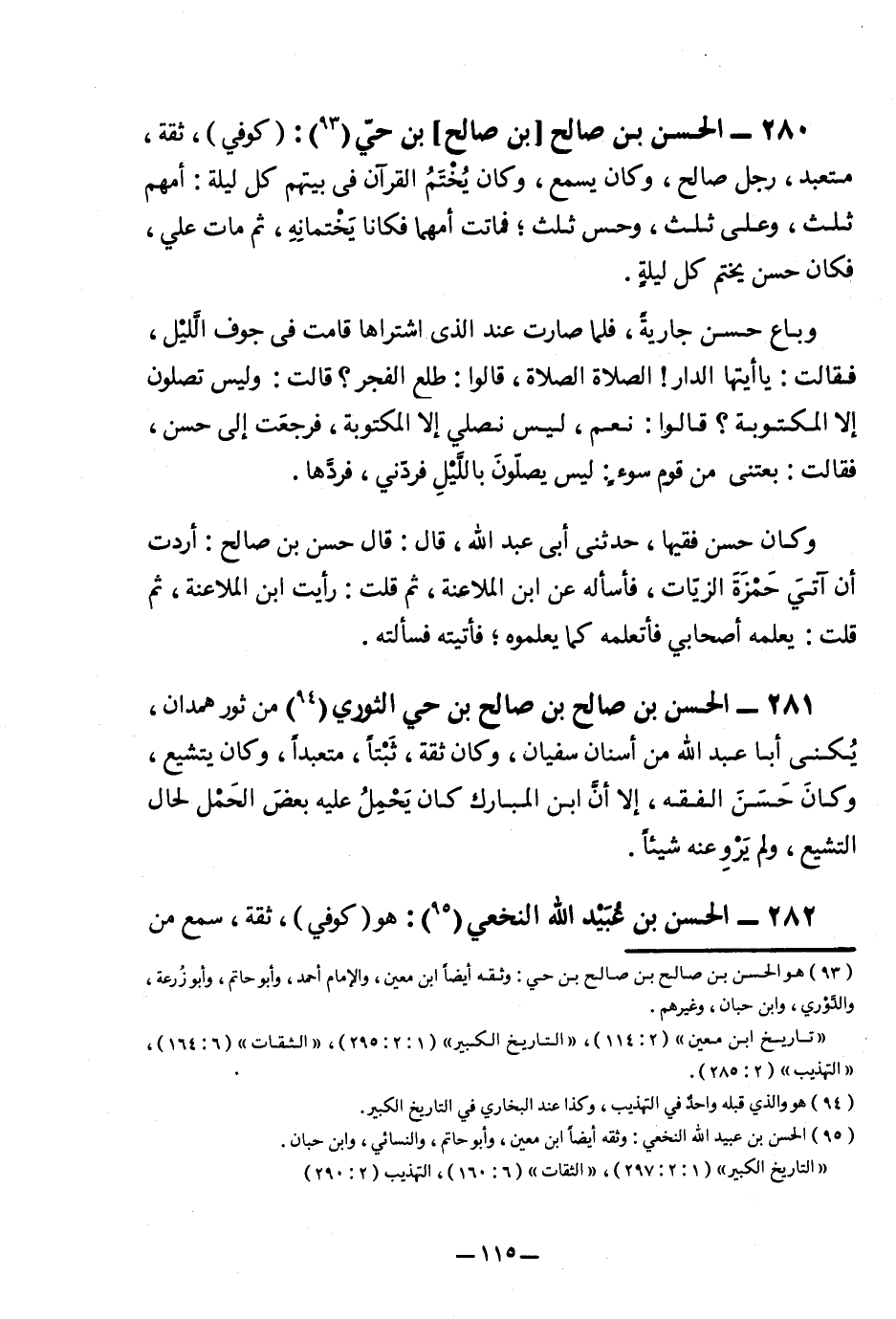 280- الحسن بن صالح "بن صالح" بن حيّ1: "كوفي"، ثقة، متعبد، رجل صالح، وكان يسمع، وكان يختم القرآن في بيتهم كل ليلة: أمهم ثلث، وعلي ثلث، وحسن ثلث؛ فماتت أمهما فكانا يختمانه، ثم مات علي، فكان حسن يختم كل ليلة.