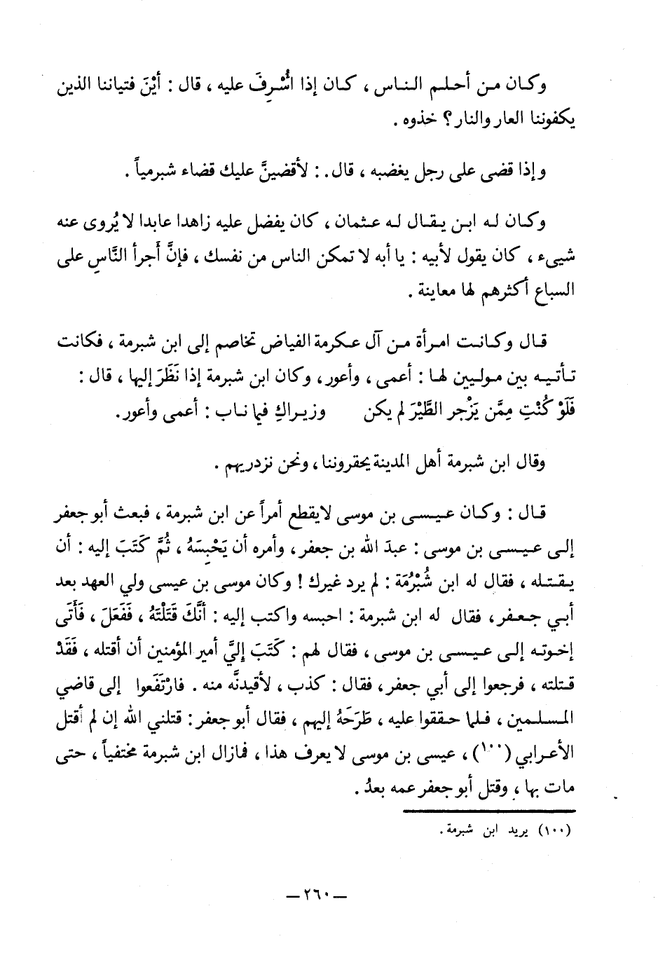 قال: وكان عيسى بن موسى لا يقطع أمرًا عن ابن شبرمة، فبعث أبو جعفر إلى عيسى بن موسى: عبدَ الله بن جعفر، وأمره أن يحبسه، ثم كتب إليه: أن يقتله، فقال له ابن شبرمة: لم يرد غيرك! وكان موسى بن عيسى ولي العهد بعد أبي جعفر، فقال له ابن شبرمة: احبسه واكتب إليه. أنك قتلته، ففعل، فأتى إخوته إلى عيسى بن موسى، فقال لهم: كتب إليّ أمير المؤمنين أن أقتله، فقد قتلته، فرجعوا إلى أبي جعفر، فقال: كذب، لأقيدنّه منه, فارتفعوا إلى قاضي المسلمين، فلما حققوا عليه، طرحه إليهم، فقال أبو جعفر: قتلني الله إن لم أقتل الأعرابي1، عيسى بن موسى لا يعرف هذا، فما زال ابن شبرمة مختفيًا، حتى مات بها، وقتل أبو جعفر عمه بعد.