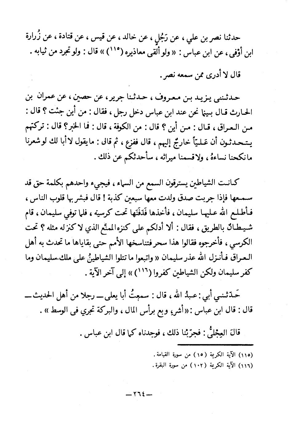 كانت الشياطين يسترقون السمع من السماء، فيجيء واحدهم بكلمة حق قد سمعها فإذا جربت صدق ولدت معها سبعين كذبة! قال فبشر بها قلوب الناس، فأطلع الله عليها سليمان، فأخذها فدفنها تحت كرسيه، فلما توفي سليمان، قام شيطان بالطريق، فقال: ألا أدلكم على كنزه الممنَّع الذي لا كنز له مثله؟ تحت الكرسي، فأخرجوه فقالوا: هذا سحر فتناسخها الأمم حتى بقاياها ما تحدث به أهل العراق فأنزل الله عذر سليمان: {وَاتَّبَعُوا مَا تَتْلُو الشَّيَاطِينُ عَلَى مُلْكِ سُلَيْمَانَ وَمَا كَفَرَ سُلَيْمَانُ وَلَكِنَّ الشَّيَاطِينَ كَفَرُوا} 2 إلى آخر الآية.