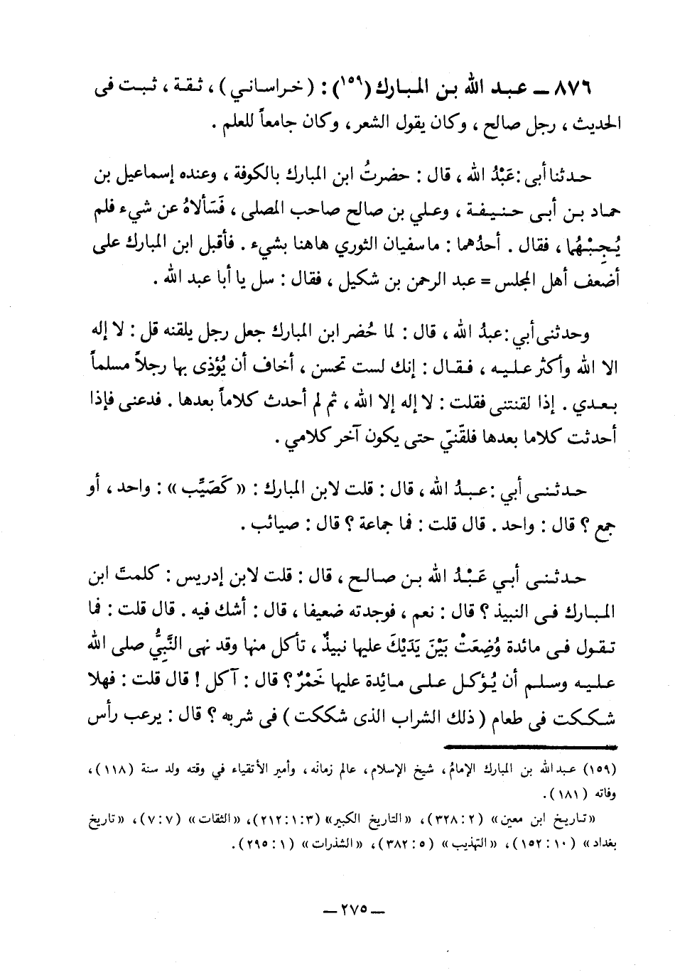 876- عبد الله بن المبارك1: "خراساني"، ثقة، ثبت في الحديث، رجل صالح، وكان يقول الشعر، وكان جامعًا للعلم.