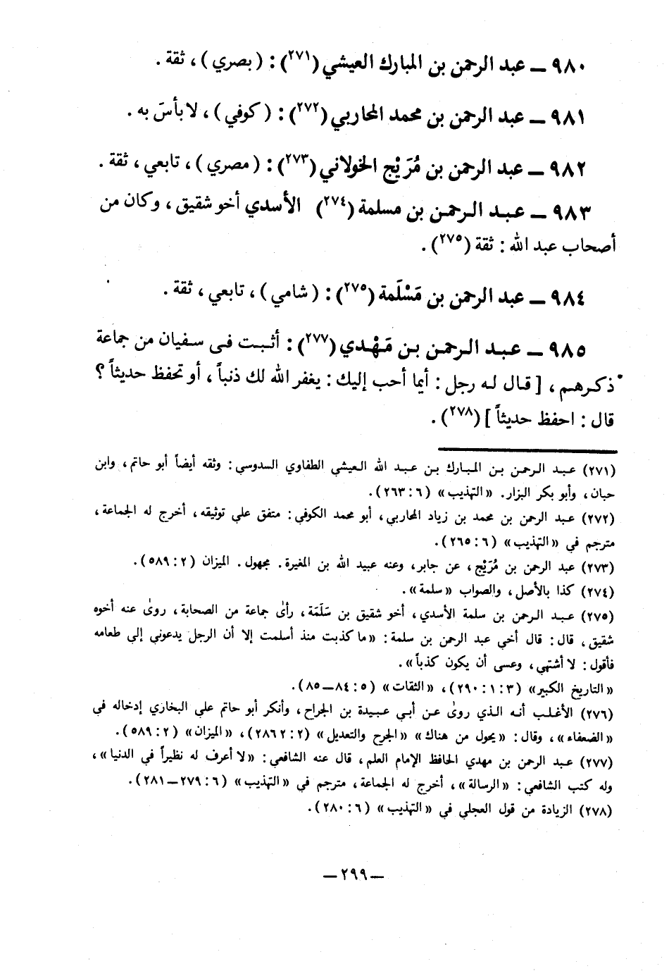 985- عبد الرحمن بن مهدي7: أثبت في سفيان من جماعة ذكرهم، "قال له الرجل: أيما أحب إليك: يغفر الله لك ذنبًا، أو تحفظ حديثًا؟ قال: أحفظ حديثًا"8.