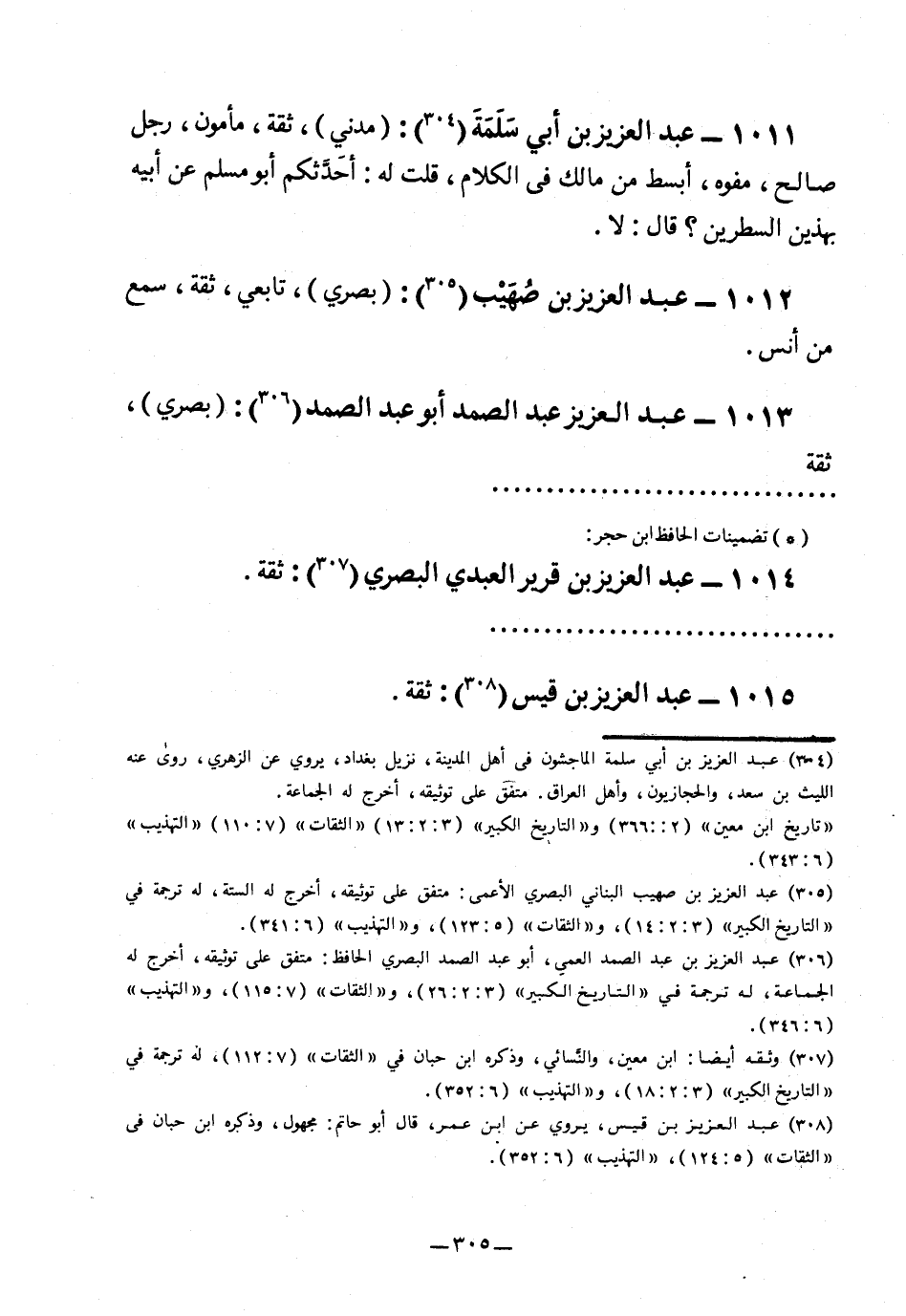 1011- عبد العزيز بن أبي سلمة1: "مدني"، ثقة، مأمون، رجل صالح، مفوه، أبسط من مالك في الكلام، قلت له: أحدثكم أبو مسلم عن أبيه بهذين السطرين؟ قال: لا.